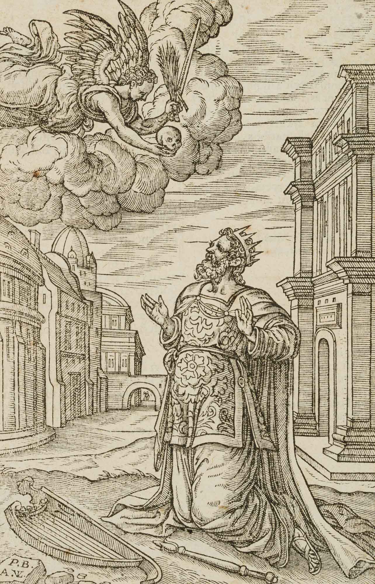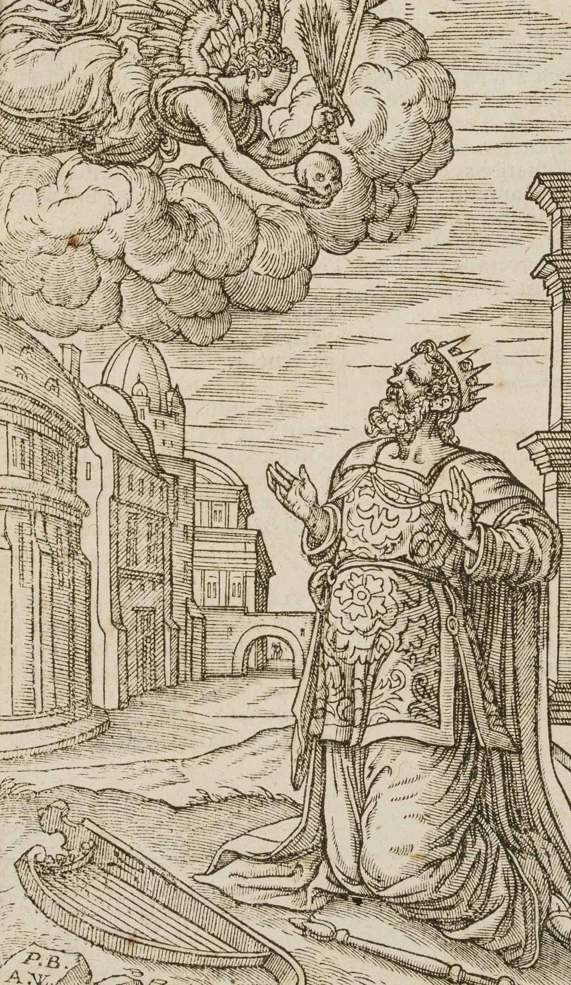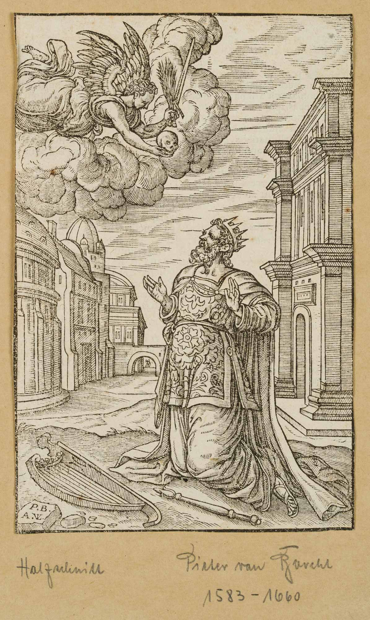 Pieter van Borcht (1535 – 1608 ) attributed, King David with angelic appearance, , Woodcut