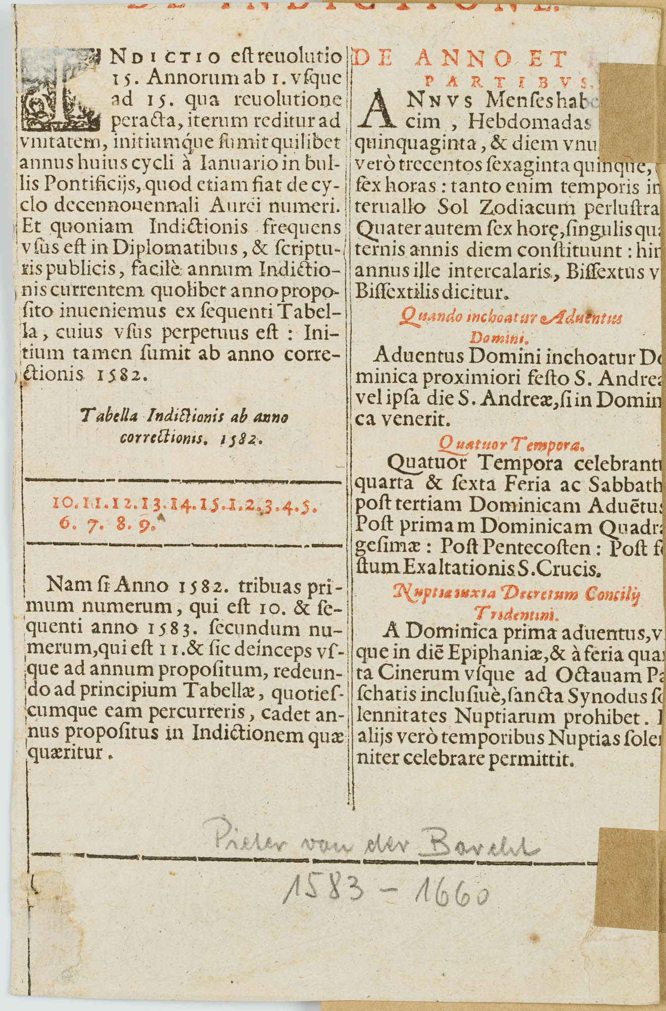 - Inscription: Monogrammed “P. B. A.VL” in the lower left corner of the print. The identity of the artist is difficult to determine. Under the name Pieter van der Borcht one or more Flemish artists were active in Antwerp, Brussels and Mechelen in the 16th and 17th centuries. The sheet is inscribed in Latin on the reverse.