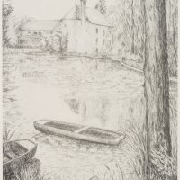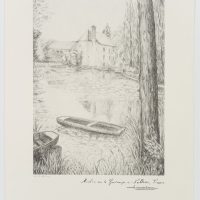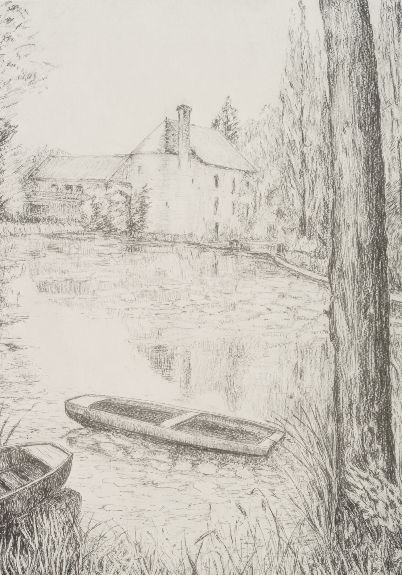 - Description: The landscape depiction opens the view from the bank of the Gartempe to the ensemble of buildings of a mill on the opposite side of the river. Two rowing boats float silently on the water in the foreground.