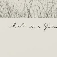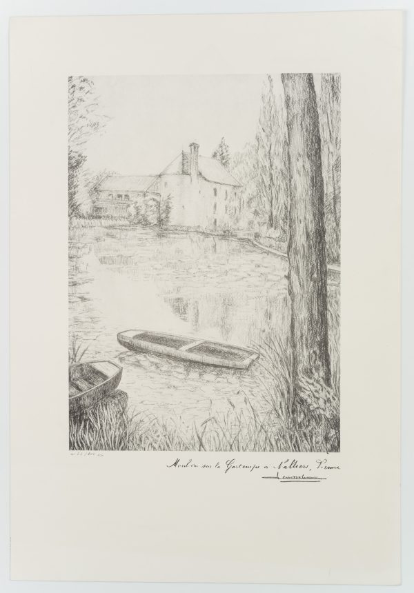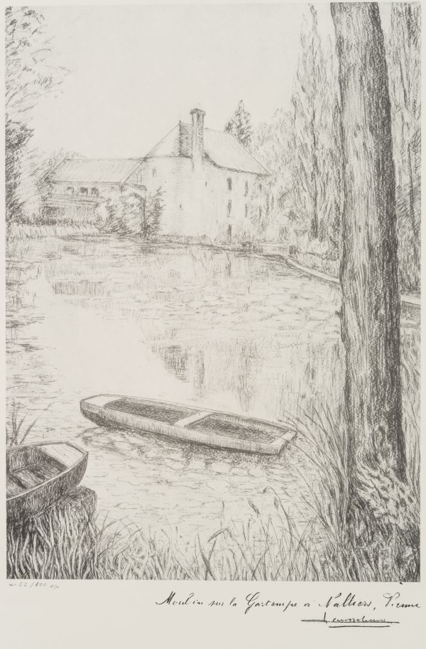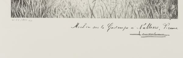 - Inscription: Numbered in pencil “n. 62 / 600 ex” on the lower left, with the facsimile inscription and unrecognisable signature of the artist to the right: “Moulin sur la Gartempe a Nalliers, Vienne”. Stamp of the printer and the CPA (Cercle Poitevin des Arts), an association for drawing and painting, on the reverse.