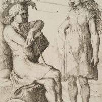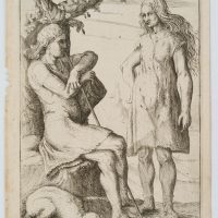 - Beschreibung: Schöne Druckqualität; unter der Darstellung paginiert “Lib. 1, Pagina 148, figura V.”; aus Philipp Clüvers 1616 erschienenem Hauptwerk “Germania antiqua”, mit dem er entscheidend zur Konsolidierung einer über Jahrhunderte nachwirkenden Germanenikonographie beitrug. Seine innovative Leistung bestand darin, eine – aus damaliger Perspektive – historisch möglichst korrekte Darstellungsweise anzustreben – hatten die Illustrationen des 16. Jahrhunderts die germanischen Protagonisten doch noch in zeitgenössischer Mode oder “Fantasiekostümen” wiedergegeben. Die hier gezeigte Radierung stammt aus dem ersten Band, der neben zwei gestochenen Landkarten insgesamt 26 unsignierte Radierungen enthält, welche von Simon Frisius, Nicolaas van Geilenkercken und einer dritten Hand aus dem Umkreis des Verlegers Hendrick Hondius d.Ä. geätzt wurden. Dargestellt sind Szenen aus dem alltäglichen Leben der germanischen Stämme, ihre religiösen Riten und Bräuche sowie gerüstete Krieger, die in den Kampf ziehen. Das in seiner “Germania antiqua” vermittelte Germanenbild blieb lange Zeit prägend, so lässt sich Clüvers Eindruck in den Bildkünsten bis weit ins 18. Jahrhundert verfolgen, wie etwa anhand der “Hermannschlacht” Daniel Chodowieckis von 1782. Literatur: Ulrich Pfisterer, Cristina Ruggero (Hg.): Phönix aus der Asche. Bildwerdung der Antike – Druckgrafiken bis 1869, München 2019, S. 33-35.