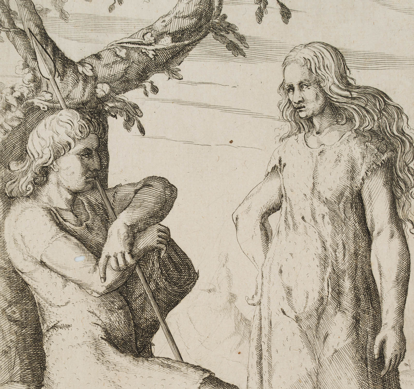 - Condition: The image makes a good impression. The sheet is foxed due to its age and soiled in the margins; left edge of the sheet and on the left side in the area of the arm with a hole.