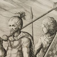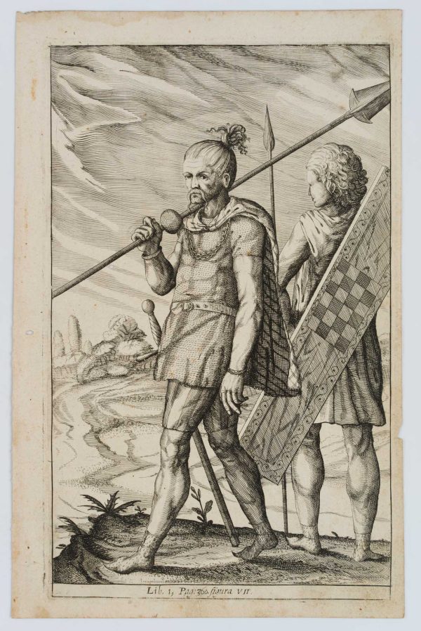 - Description: Beautiful print quality; paginated under the illustration “Lib. 1, Pagina 360, figura VII.”; from Philipp Clüver’s major work “Germania antiqua”, published in 1616, with which he decisively contributed to the consolidation of a Germanic iconography that was to have a lasting effect for centuries. His innovative achievement was to strive for the most historically accurate depiction possible – from the perspective of the time – as the illustrations of the 16th century had still depicted the Germanic protagonists in contemporary fashion or “fantasy costumes”. The etching shown here is from the first volume, which, in addition to two engraved maps, contains a total of 26 unsigned etchings, which were etched by Simon Frisius, Nicolaas van Geilenkercken and a third hand from the circle of the publisher Hendrick Hondius the Elder. Depicted are scenes from the everyday life of the Germanic tribes, their religious rites and customs as well as armed warriors going into battle. The image of the Germanic tribes conveyed in his “Germania antiqua” remained influential for a long time, and Clüver’s impression on the visual arts can be traced well into the 18th century, for example in Daniel Chodowiecki’s “Hermannschlacht” from 1782. Literature: Ulrich Pfisterer, Cristina Ruggero (eds.): Phönix aus der Asche. Bildwerdung der Antike – Druckgrafiken bis 1869, Munich 2019, pp. 33-35.