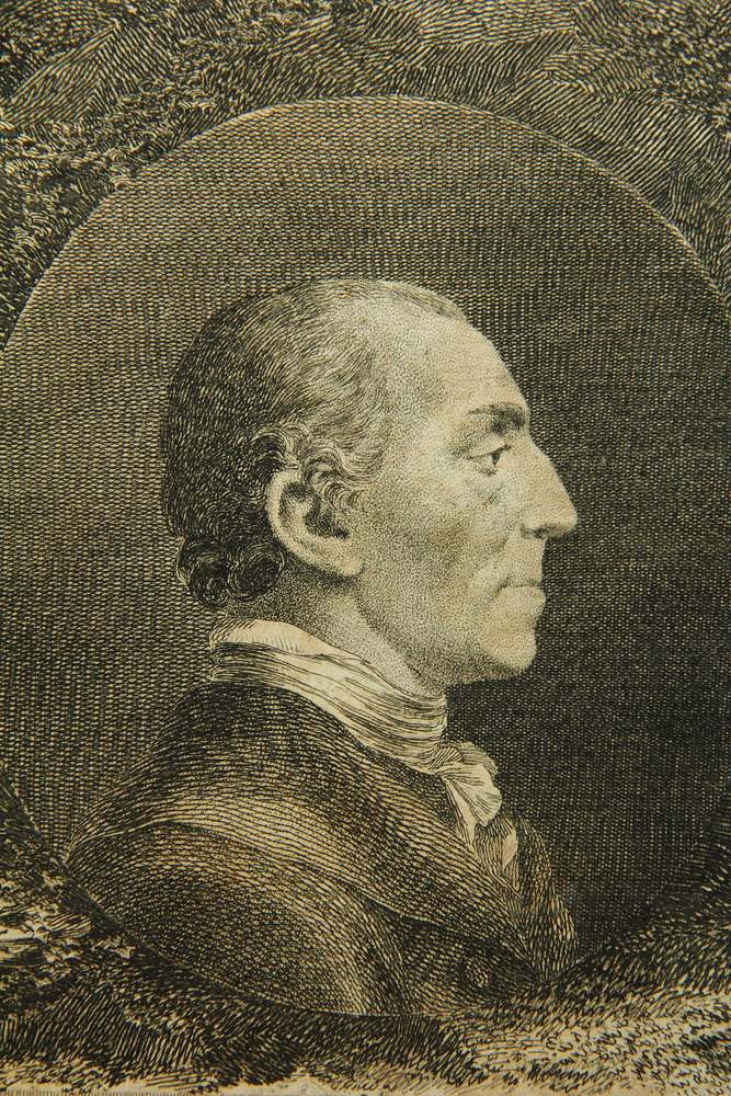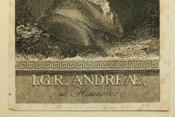 - Bezeichnung: Unterhalb der Darstellung mit dem Namen des Dargestellten versehen. Darunter in der Druckplatte vom Künstler signiert und auf 1786 datiert. Vermutlich handelt es sich um ein Frontispiz zu Friedrich Nicolais Allgemeine deutsche Bibliothek von 1787.