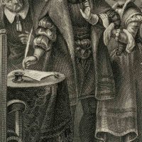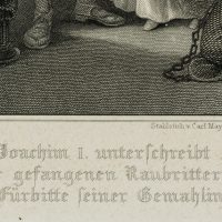 Joachim I of Brandenburg is shown signing a document. The Elector has raised his left arm defensively. The title of the depiction provides information about the scene: His wife’s intercession seems to be for the captured robber knights. Two of the knights can be seen with bowed heads at the lower right edge of the picture.