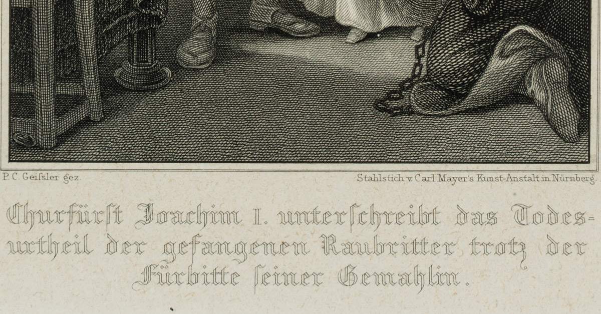 Peter Carl Geissler (1802 Leipzig – 1872 Nürnberg), Joachim I von Brandenburg (1484 Cölln-1535 Stendal) unterschreibt das Todesurteil der Raubritter, 19. Jahrhundert, Stahlstich