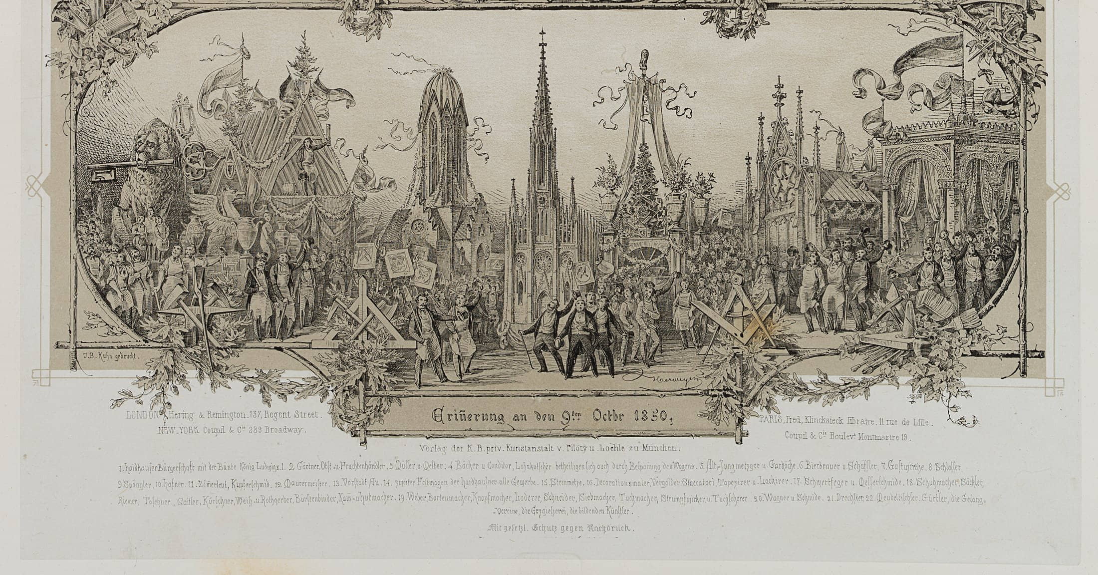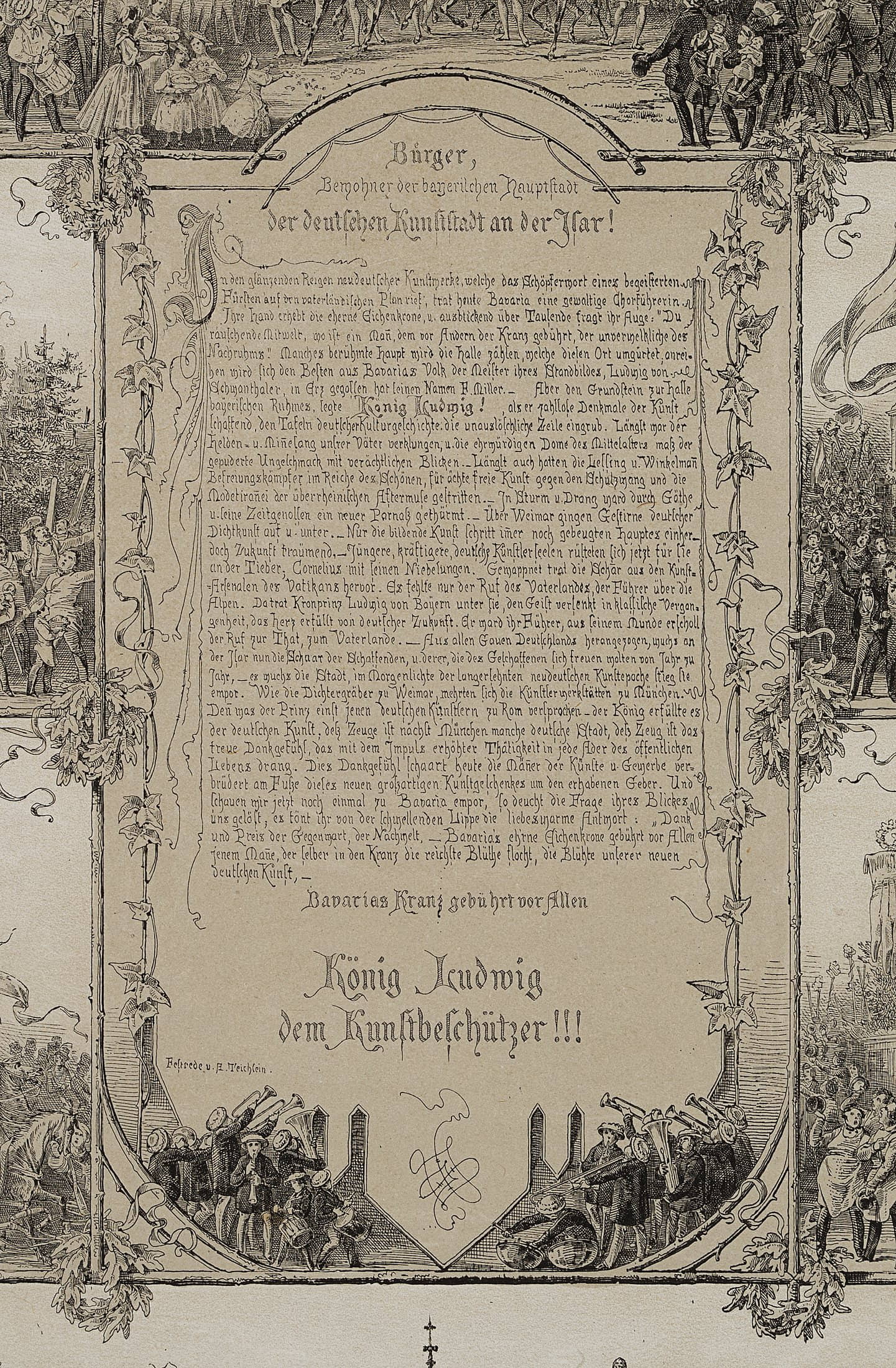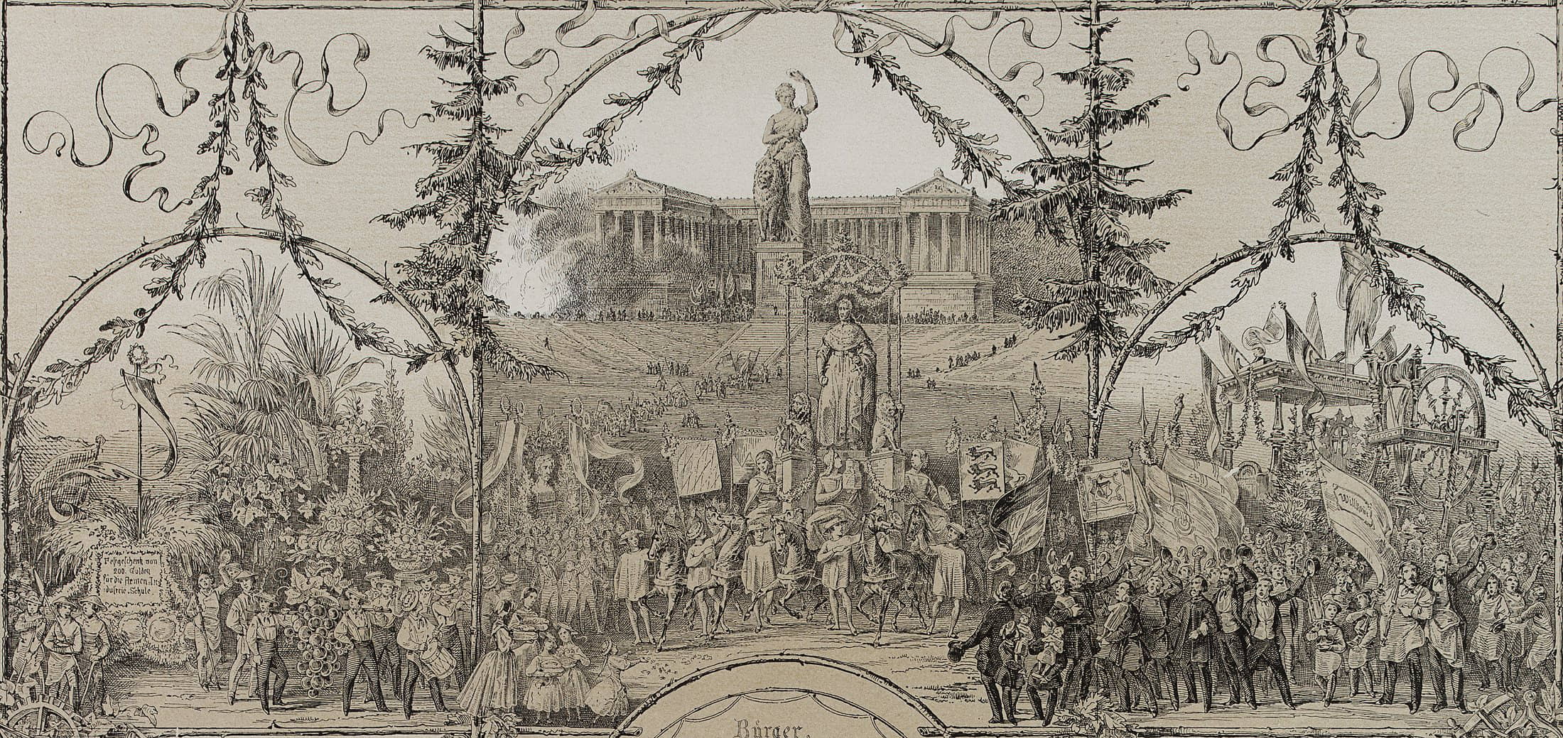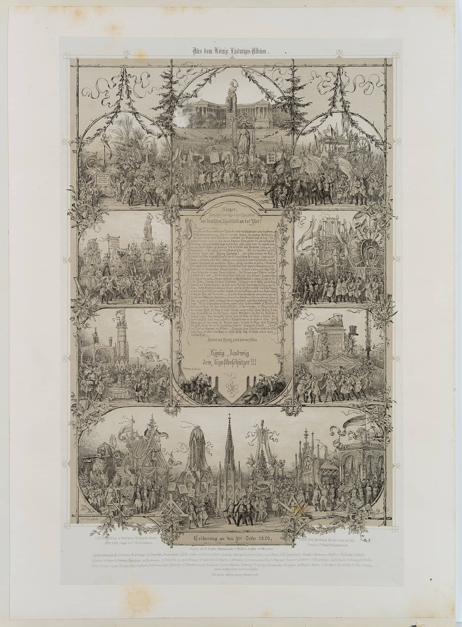 Peter Herwegen (1814 Köln – 1893 München), König Ludwig dem Kunstbeschützer, Festzug zur Enthüllung der Bavaria, um 1850, Lithographie