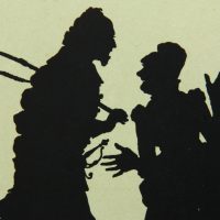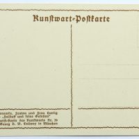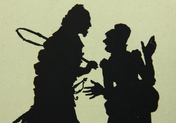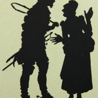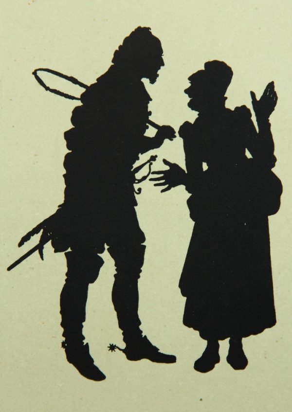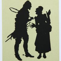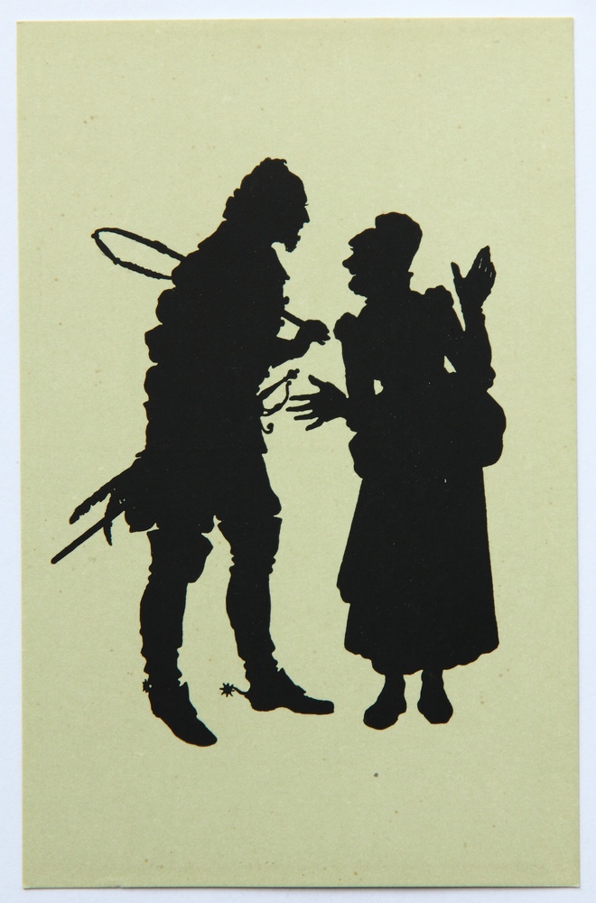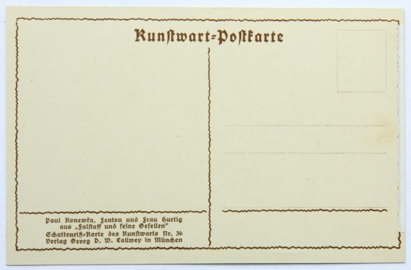 - Description: Silhouette depiction from a series of Shakespeare illustrations by Konewka. Shows “Fenton and Mrs Hurtig” in full-figure view. On the reverse is the printed layout of a postcard with the text field: “Paul Konewka, Fenton und Frau Hurtig aus “Falstaff und seine Gesellen” Schattenriß-Karte des Kunstwarts Nr. 36 Verlag Georg D.W. Callwey in München”.
