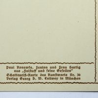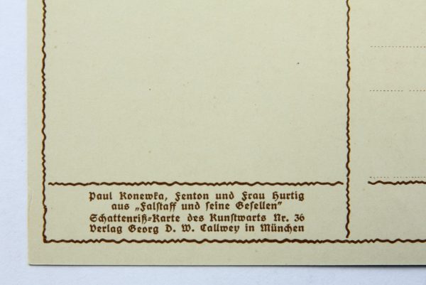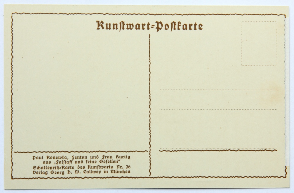 - Beschreibung: Silhouettendarstellung aus einer Reihe von Shakespeare-Illustrationen Konewkas. Zeigt in ganzfiguriger Ansicht “Fenton und Frau Hurtig”. Rückseitig befindet sich das aufgedruckte Layout einer Postkarte mit dem Textfeld: “Paul Konewka, Fenton und Frau Hurtig aus “Falstaff und seine Gesellen” Schattenriß-Karte des Kunstwarts Nr. 36 Verlag Georg D.W. Callwey in München”.