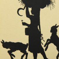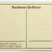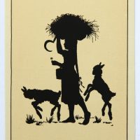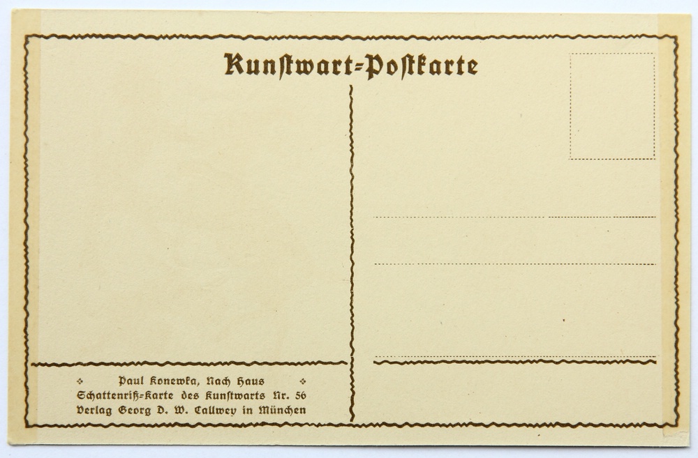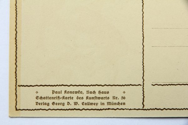 Zeigt in ganzfiguriger silhouettenhafter Ansicht ein Mädchen mit geschnittenem Gras und einer Sichel, die mit zwei freudig springenden Lämmern auf dem Heimweg ist. Rückseitig befindet sich das aufgedruckte Layout einer Postkarte mit dem Textfeld: ” * Paul Konewka, Nach Haus * Schattenriß-Karte des Kunstwarts Nr. 56 Verlag Georg D.W. Callwey in München”.
