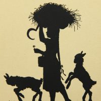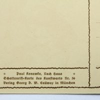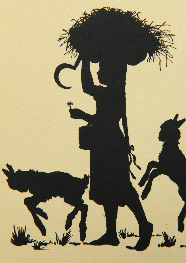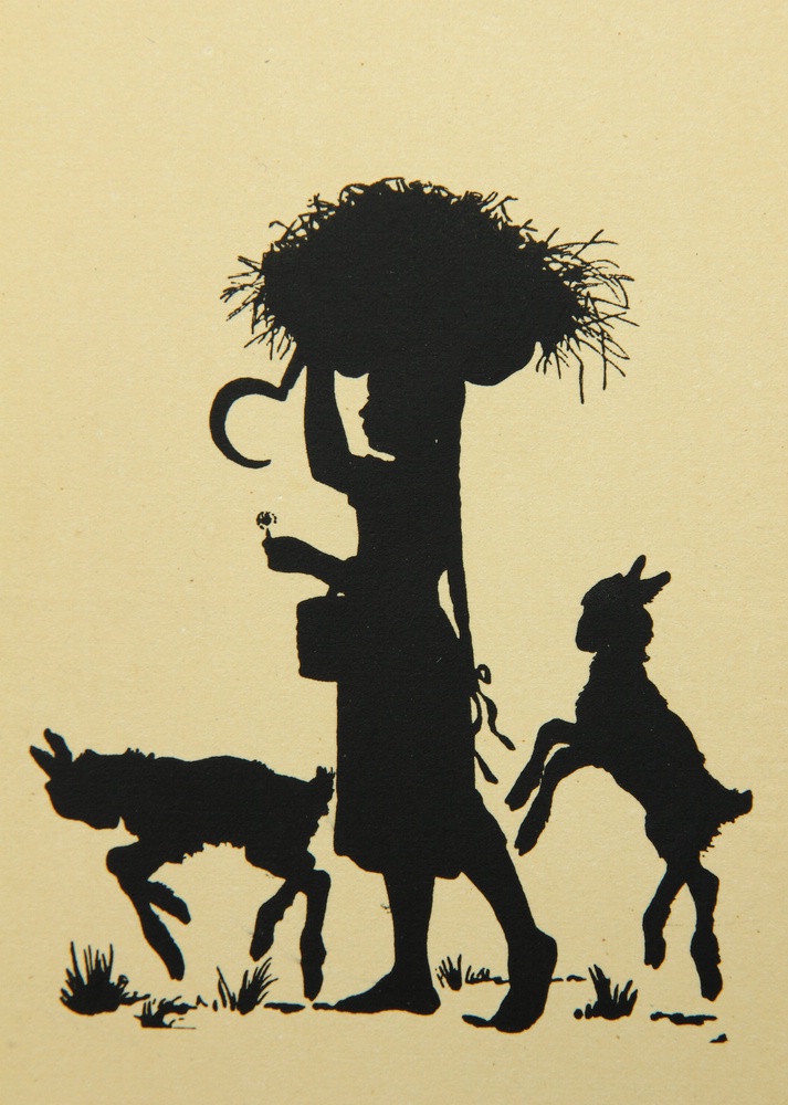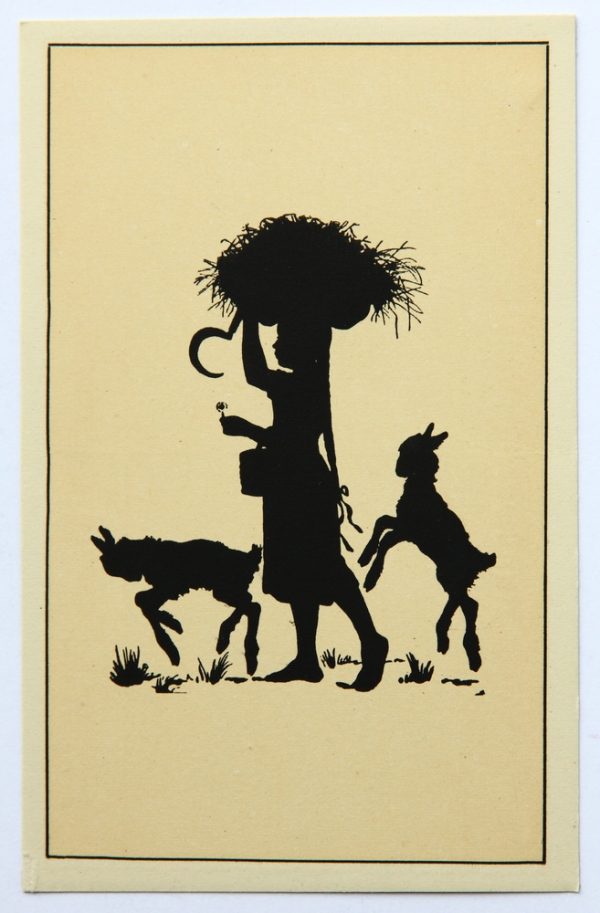 • Description: Shows in full-figure silhouetted view a girl with cut grass and a sickle on her way home with two lambs jumping joyfully. On the reverse is the printed layout of a postcard with the text field: ” * Paul Konewka, Nach Haus * Schattenriß-Karte des Kunstwarts Nr. 56 Verlag Georg D.W. Callwey in München”.