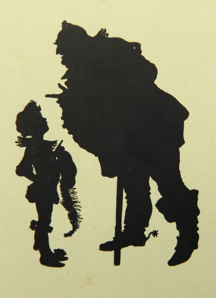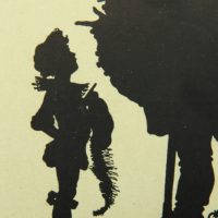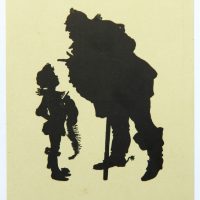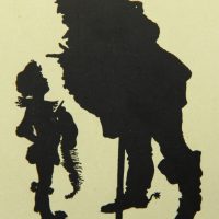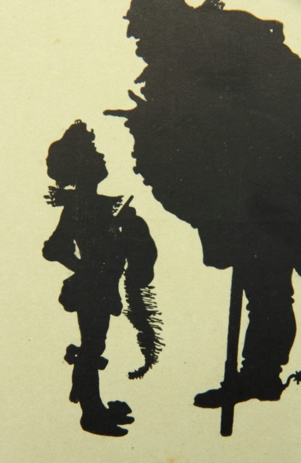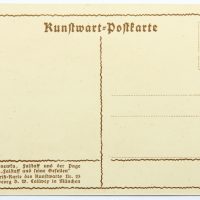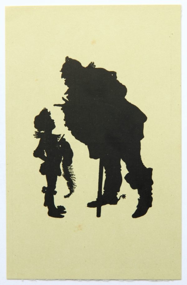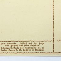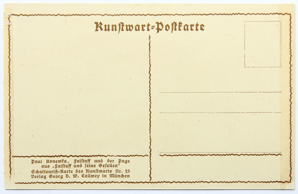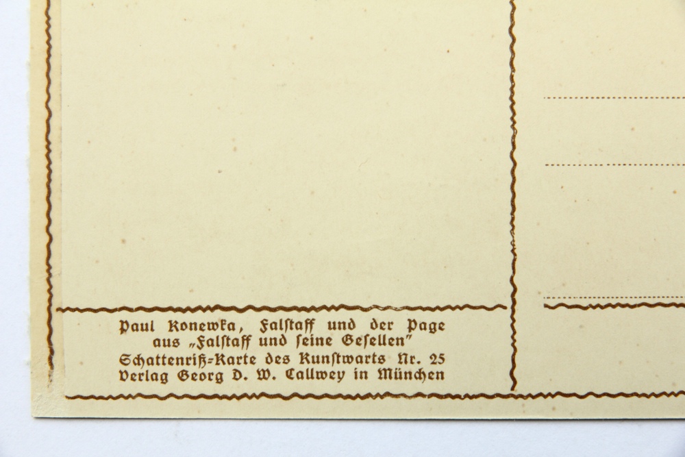 - Description: Lithograph on pale green cardboard. Silhouette depiction from a series of Shakespeare illustrations by Konewka. Showing a full-figure view of “Falstaff and the Page”. On the reverse is the printed layout of a postcard with the text field: “Paul Konewka, Falstaff und der Page aus “Falstaff und seine Gesellen” Schattenriß-Karte des Kunstwarts Nr. 25 Verlag Georg D.W. Callwey in München”.