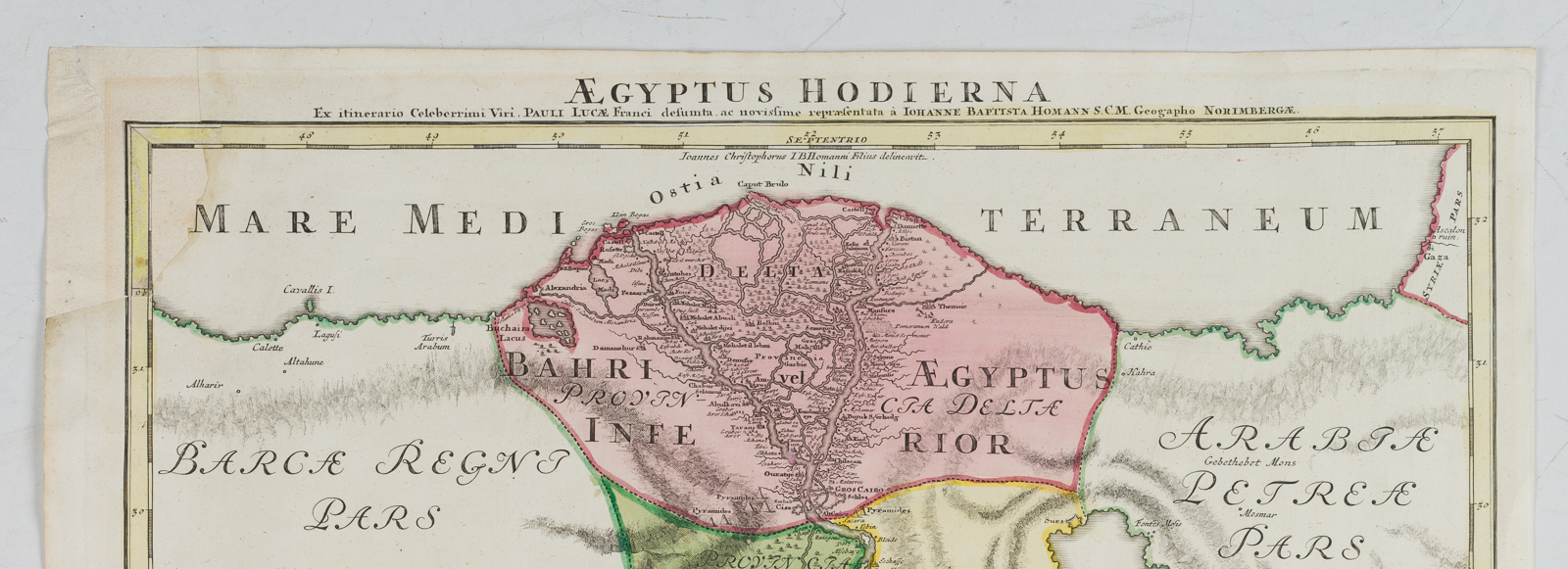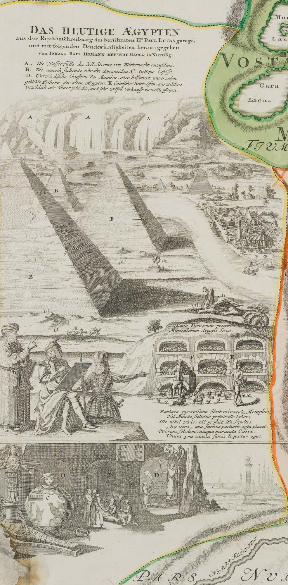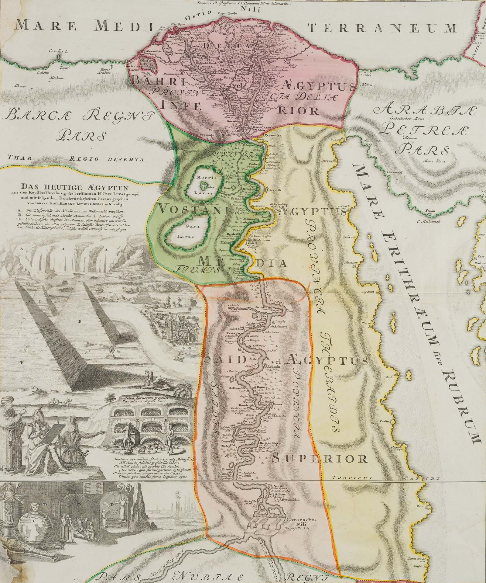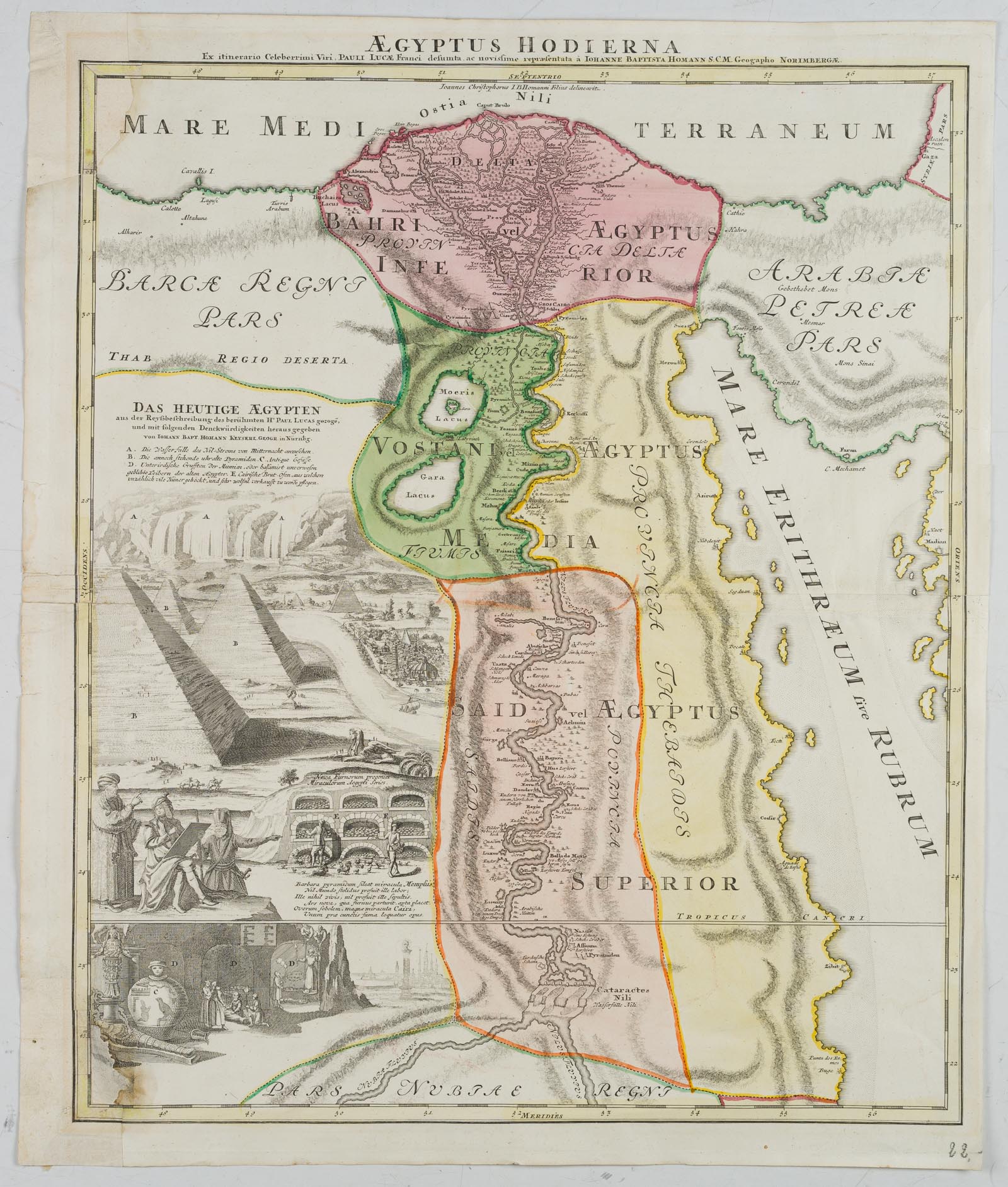 - Bezeichnung: Links fünf Ansichten als Kartusche. Sie zeigen die Nil-Fälle, mehrere Pyramiden, Grotten und den reisenden Künstler am Zeichenbrett mit zwei Ägyptern. Paul Lucas war ein französischer Kaufmann, Forschungsreisender und Altertumskundler im Dienst Ludwigs XIV. Er unternahm drei ausgedehnte Reisen nach Ägypten und in den vorderen Orient. Die Karte wurde von Johann Baptist HOMANN (1664 Oberkammlach – 1724 Nürnberg) herausgegeben. Dank diesen Forschungsreisen konnte die vorliegende illustrierte Karte entstehen.