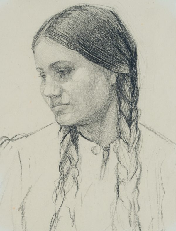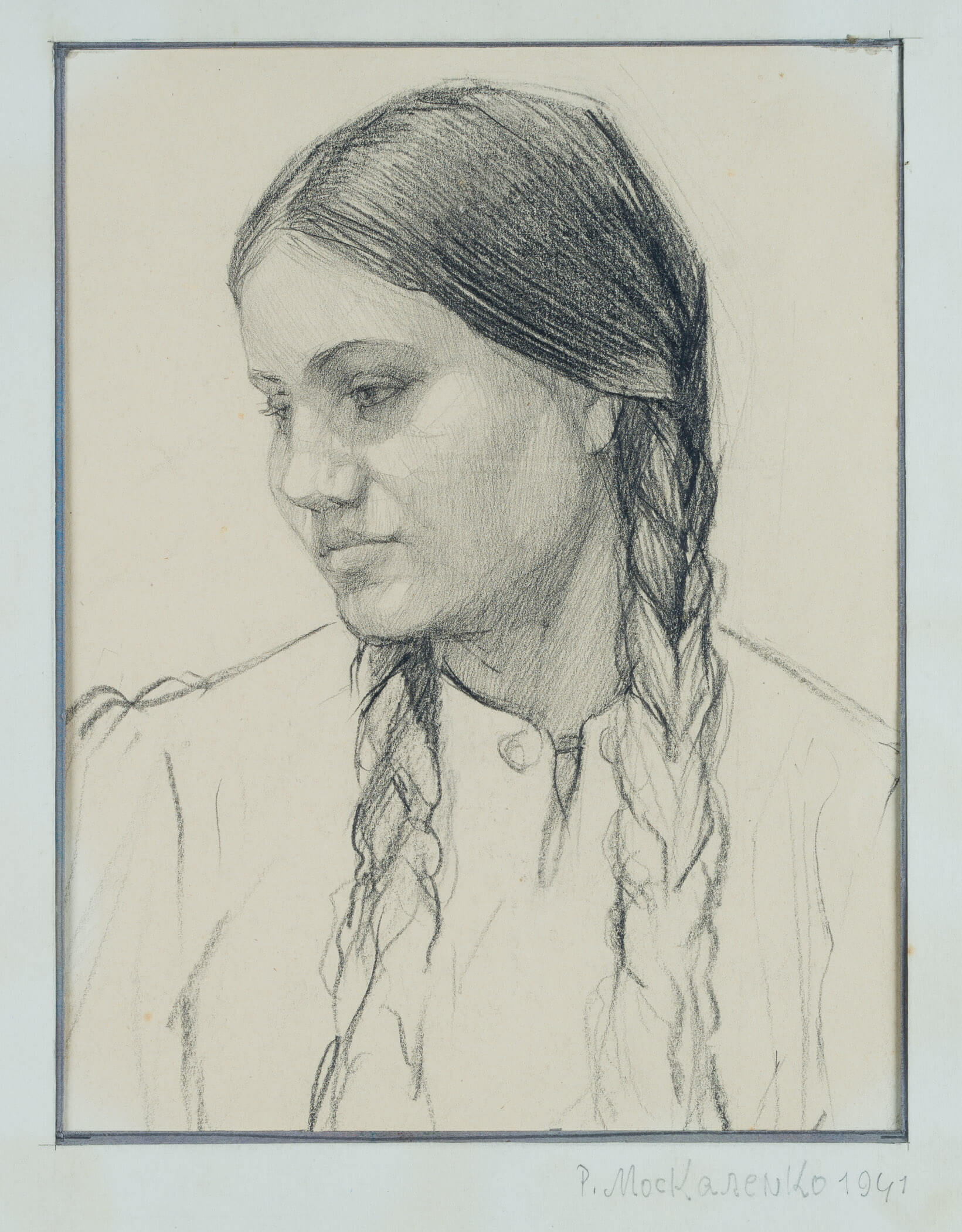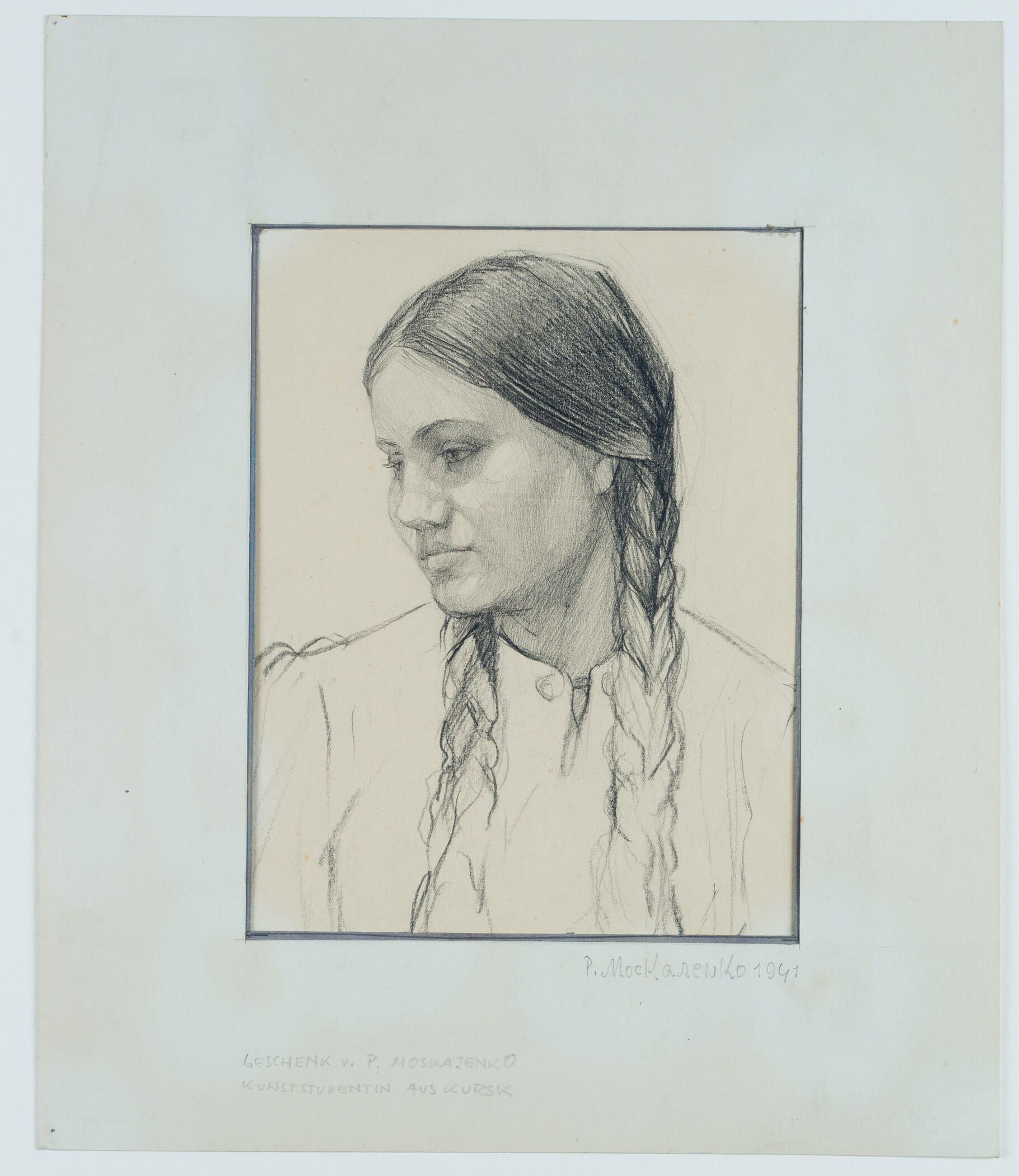 P. Moskajenko (20th century), Breast portrait of a young woman with long plaits, almost in profile looking to the left, Russia, 1941, Pencil