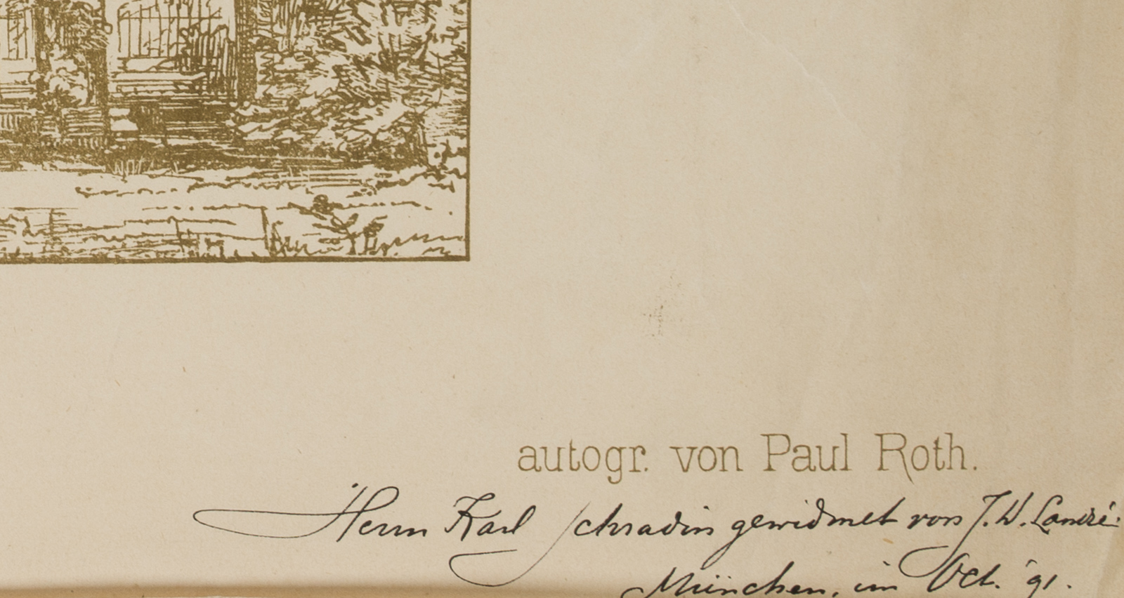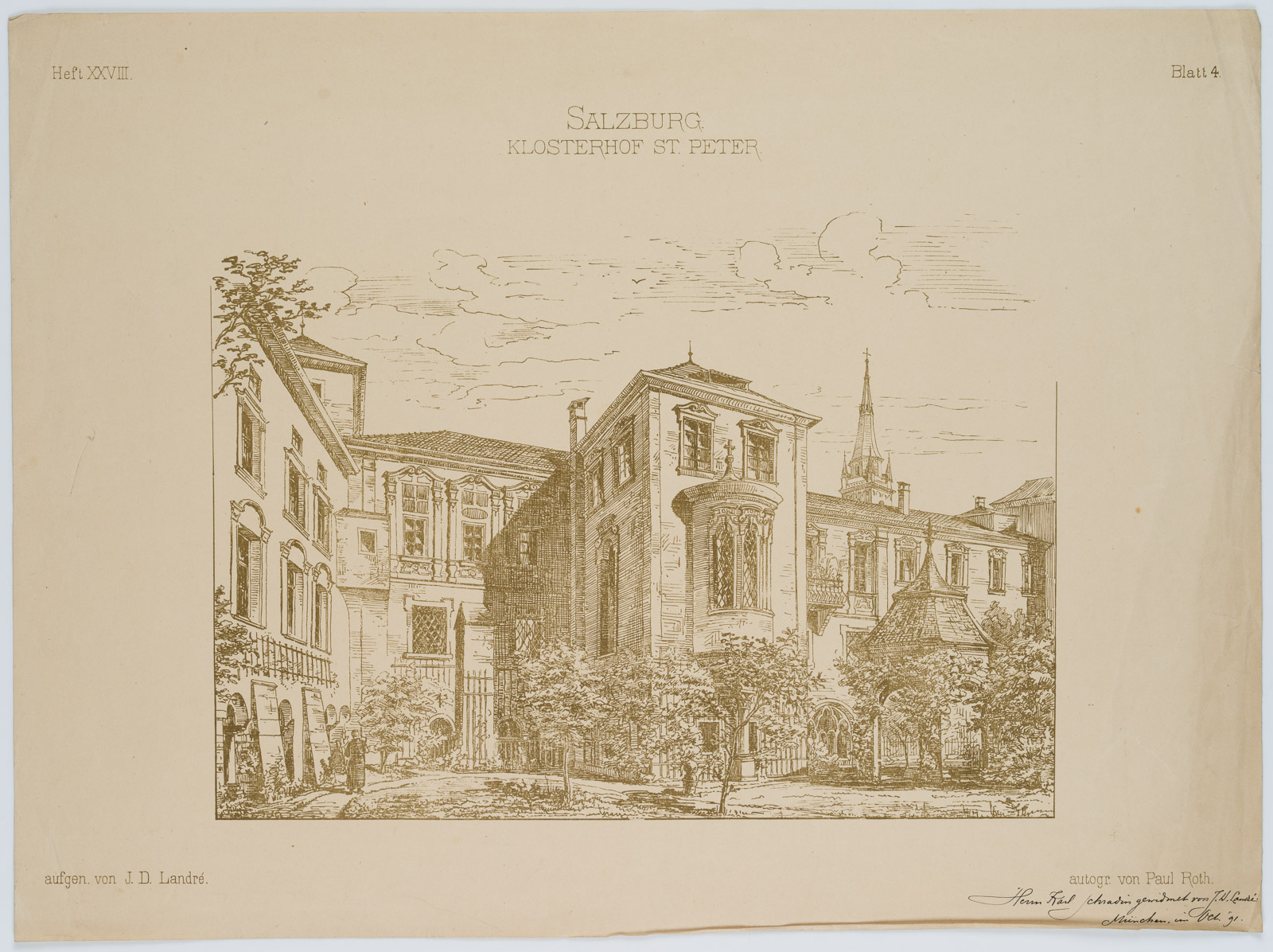 Mittig über der Darstellung betitelt, in der linken Blattecke: “Heft XXVIII”; rechts: “Blatt 4.”. Unter der Darstellung signiert und mit Dedikation: “aufgen. von J.D. Landré. / autogr. von Paul Roth. / Herrn Karl Schradin [Deutscher Architekt, tätig in Karlsruhe] gewidmet von J. W. Landré, München im Okt. 91”.