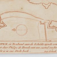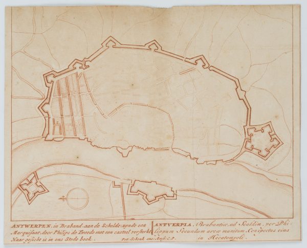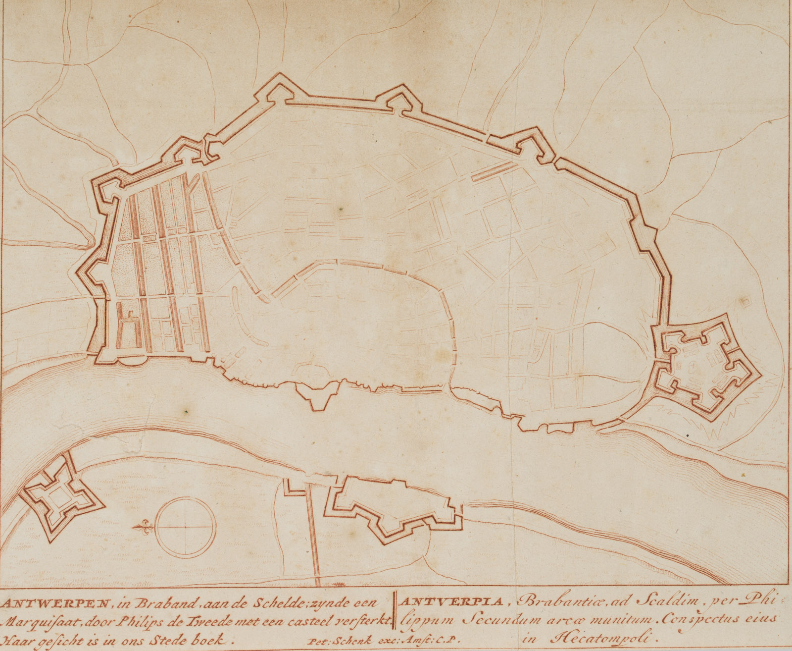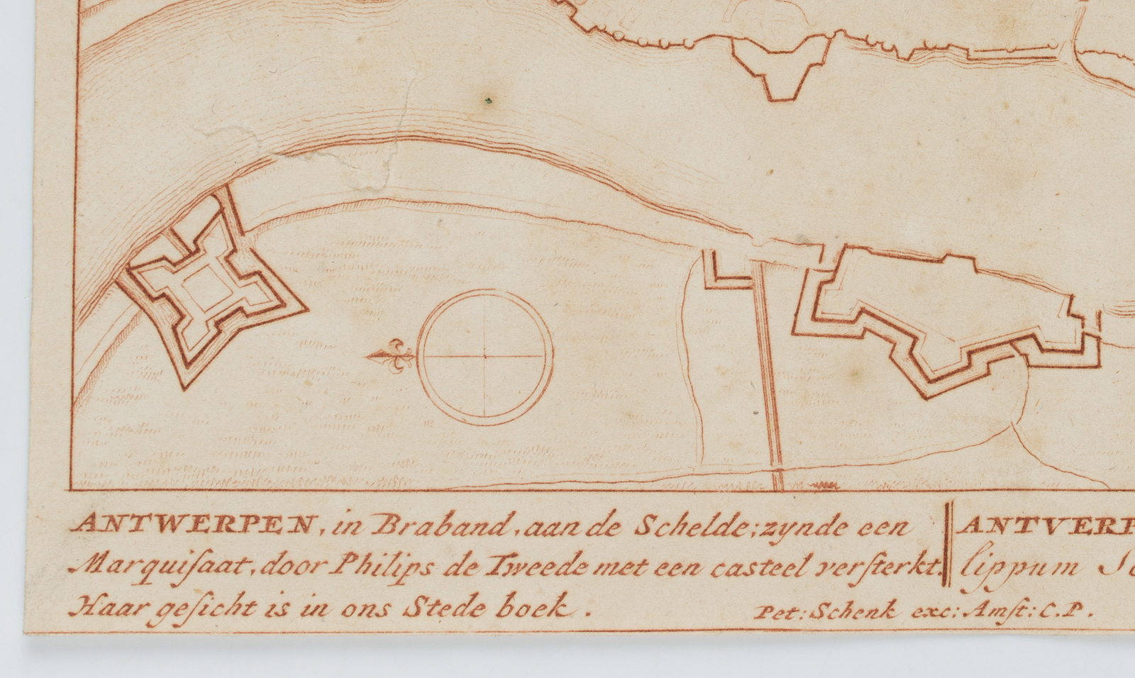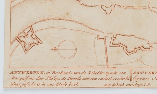 - Inscription: Inscribed below the image in Dutch and Latin: “Antwerpen, in Braband, aan de Schelde, zynde een Marquisaat, door Philips de Tweede met een casteel versterkt Haar gesicht is in ons Stede boek”. Parallel title: “Antverpia, Brabantiæ, ad Scaldim, per Philippum Secundum arcæ munitum conseptus eius in Hacatompoli”. Signed in the centre below the depiction and with an indication of the place: “Pet. Schenk exc. Amst C. P.”. Peter Schenk the Elder was a German engraver and cartographer from Elberfeld, today Wuppertal. Around 1684 he moved to Amsterdam and became a pupil of Gerard Valck, specialising in mezzotint; he travelled to Leipzig and Berlin. Until his death in 1718/19 he published numerous maps and pictures. Please also note our other works in the Peter Schenk series.