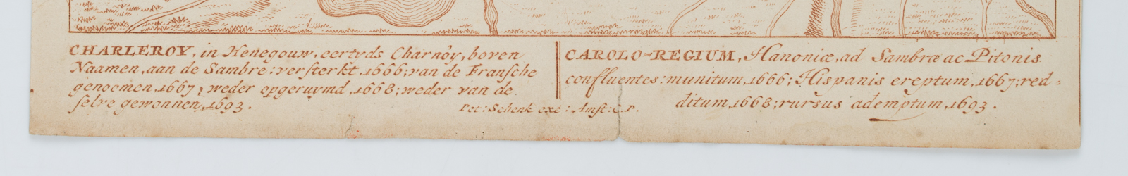 - Inscription: Inscribed below the image in Dutch and Latin: “Charleroy, in Henegouw, eertyds Charnoy, boven Naamen, aan de Sambre: versterkt 1666, van de Fransche genoomen 1667, weder opgeruymd, 1668, weder van de selve gewonnen, 1693 ; parallel title: Carolo-Regium, Hanoniæ ad Sambræ …”. Signed in the centre below the depiction and with indication of place: “Pet. Schenk exc. Amst C. P.”. Peter Schenk the Elder was a German engraver and cartographer from Elberfeld, today Wuppertal. Around 1684 he moved to Amsterdam and became a pupil of Gerard Valck, specialising in mezzotint; he travelled to Leipzig and Berlin. Until his death in 1718/19 he published numerous maps and pictures. Please also note our other works in the Peter Schenk series.
