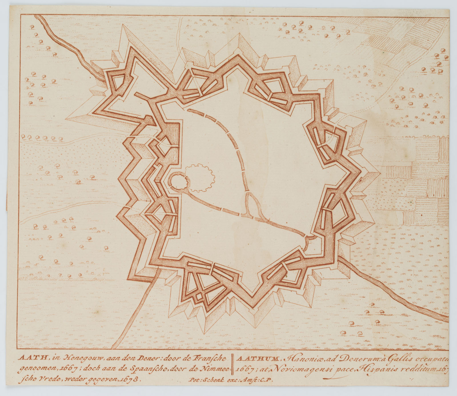 - Inscription: Inscribed below the image in Dutch and Latin: “Aath, in Henegouw, aan den Dener door de Fransche genoomen, 1667 : doch aan de Spaansche, door de Nimmeesche Vrede, weder gegeven 1678”. Signed in the plate and with indication of place: “Pet. Schenk exc. Amst C. P.”.