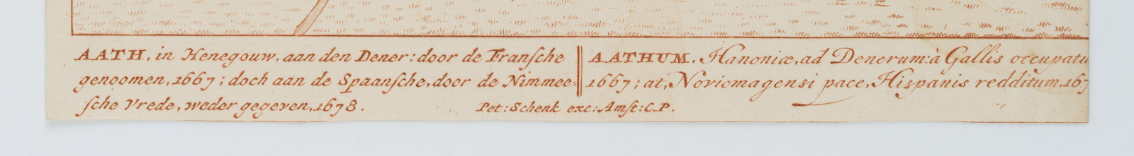 - Bezeichnung: Unterhalb der Darstellung bezeichnet in Niederländisch und Latein: “Aath, in Henegouw, aan den Dener door de Fransche genoomen, 1667 : doch aan de Spaansche, door de Nimmeesche Vrede, weder gegeven 1678”. In der Platte signiert und mit Ortsangabe: “Pet. Schenk exc. Amst C. P.”.