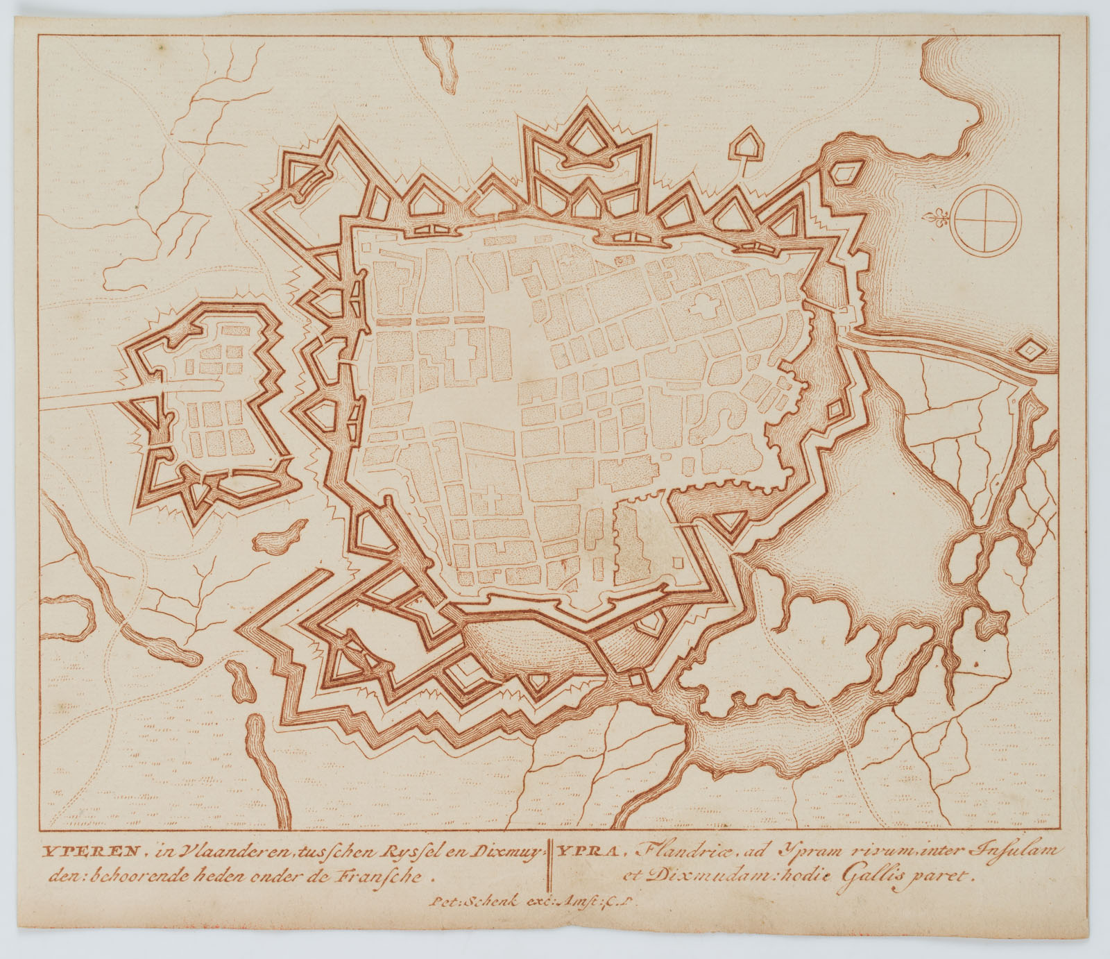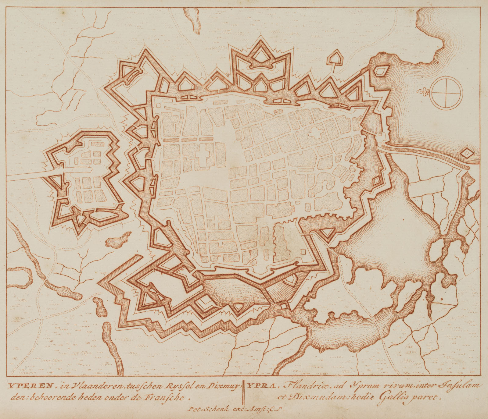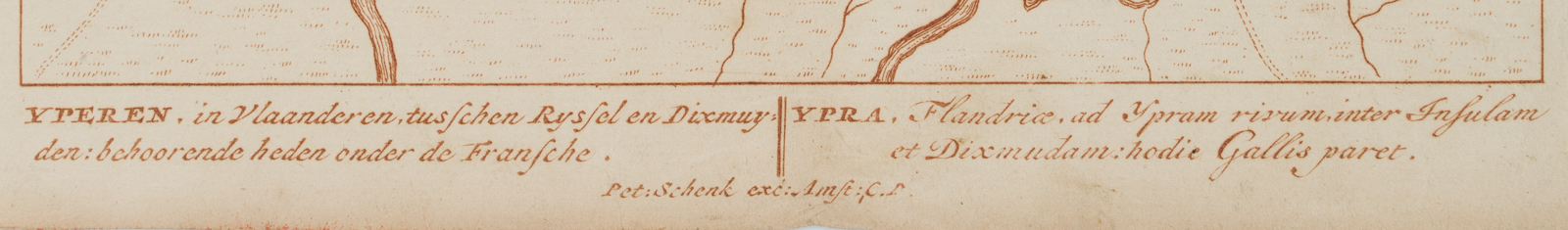 - Bezeichnung: Unterhalb der Darstellung bezeichnet in Niederländisch und Latein: Yperen, in Vlaanderen, tuschen Ryssel en Dixmuyden behoorende heden onder de Fransche. In der Platte signiert und mit Ortsangabe: “Pet. Schenk exc. Amst C. P.”.
