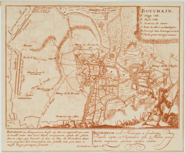 Pieter Schenk (1660 Elberfeld – 1718 Amsterdam), Map of the Battle of Bouchain 12 September 1711, Siege of Bouchain, c. 1730, Copper engraving