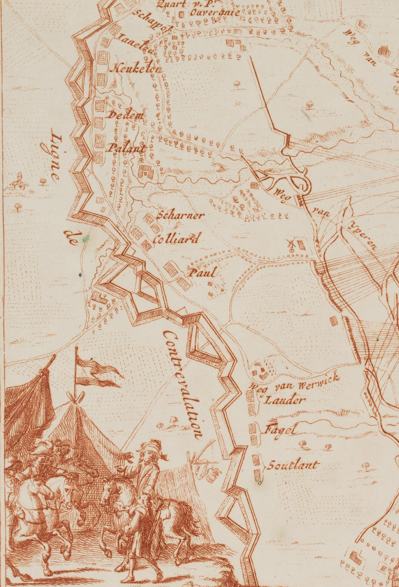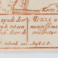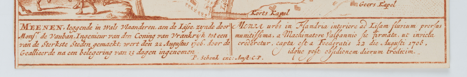 - Bezeichnung: Unterhalb der Darstellung bezeichnet in Niederländisch und Latein: “Meenen, leggende in Wals Vlaanderen aen de Lisse..”. In der Platte signiert und mit Ortsangabe: “Pet. Schenk exc. Amst C. P.”.