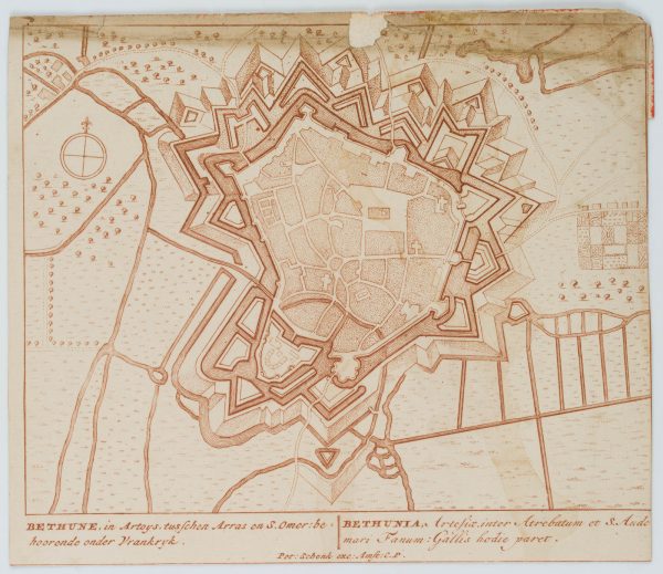 Pieter Schenk (1660 Elberfeld – 1718 Amsterdam), Copper engraving Plan Béthune, France, c. 1712, Copper engraving