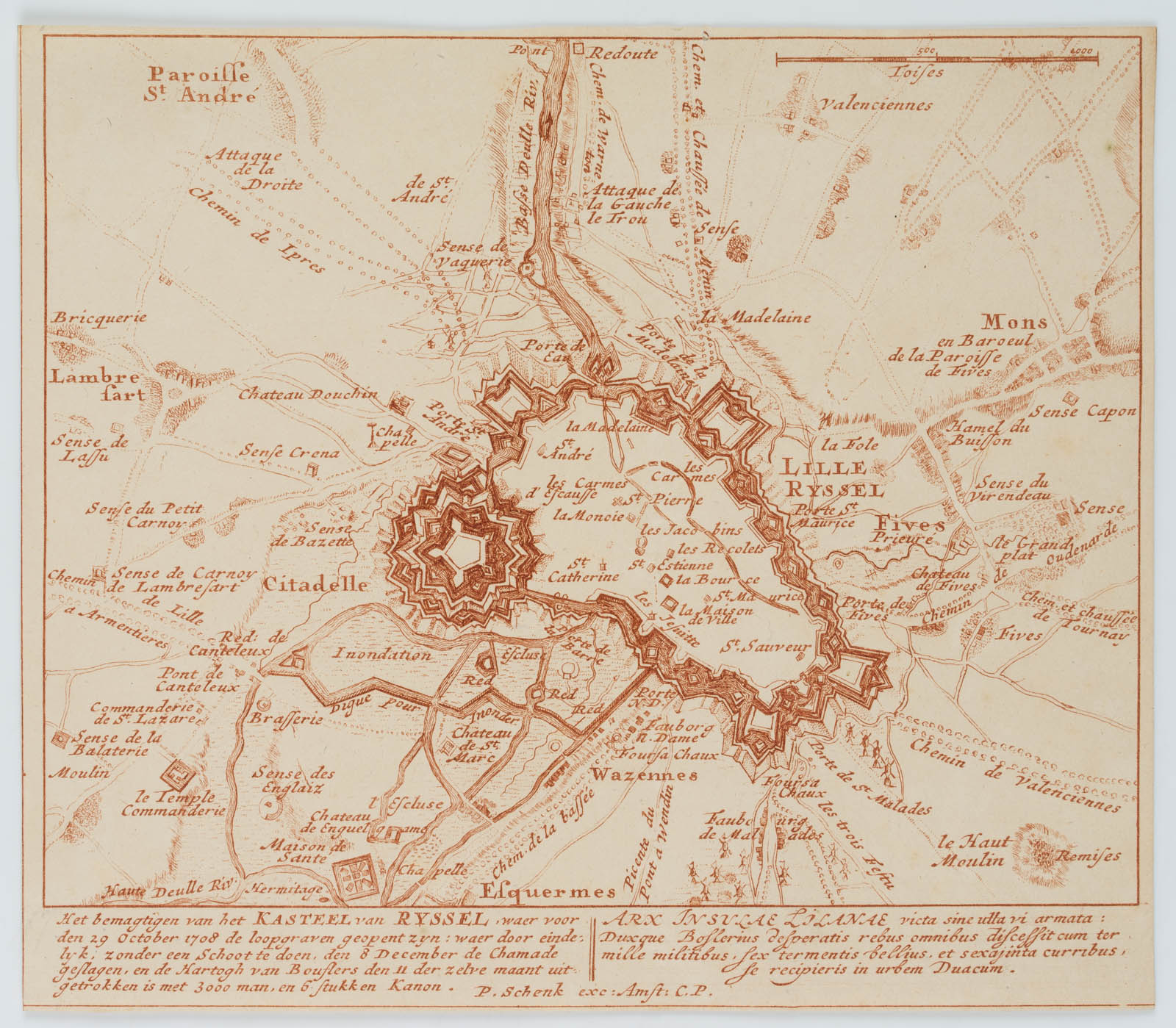 Pieter Schenk (1660 Elberfeld – 1718 Amsterdam), Copper engraving Plan Citadelle de Lille, Citadelle de Lille, pentagon, 1712, Copper engraving