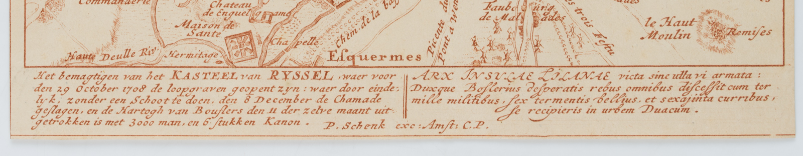- Bezeichnung: Unterhalb der Darstellung bezeichnet in Niederländisch und Latein. In der Platte signiert und mit Ortsangabe: “Pet. Schenk exc. Amst C. P.”.