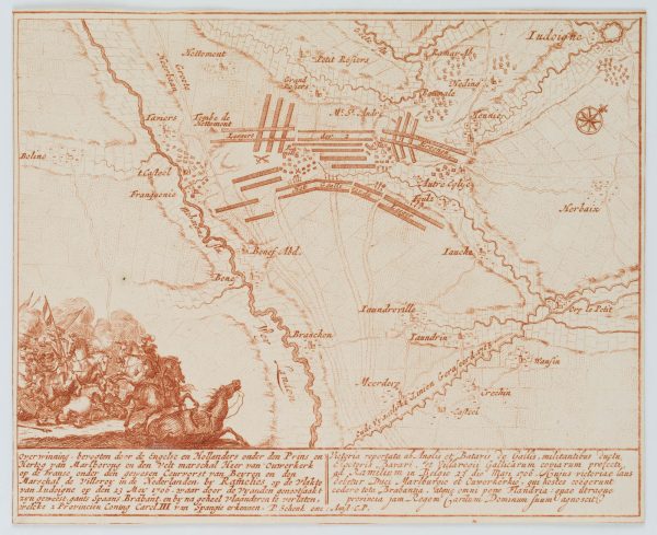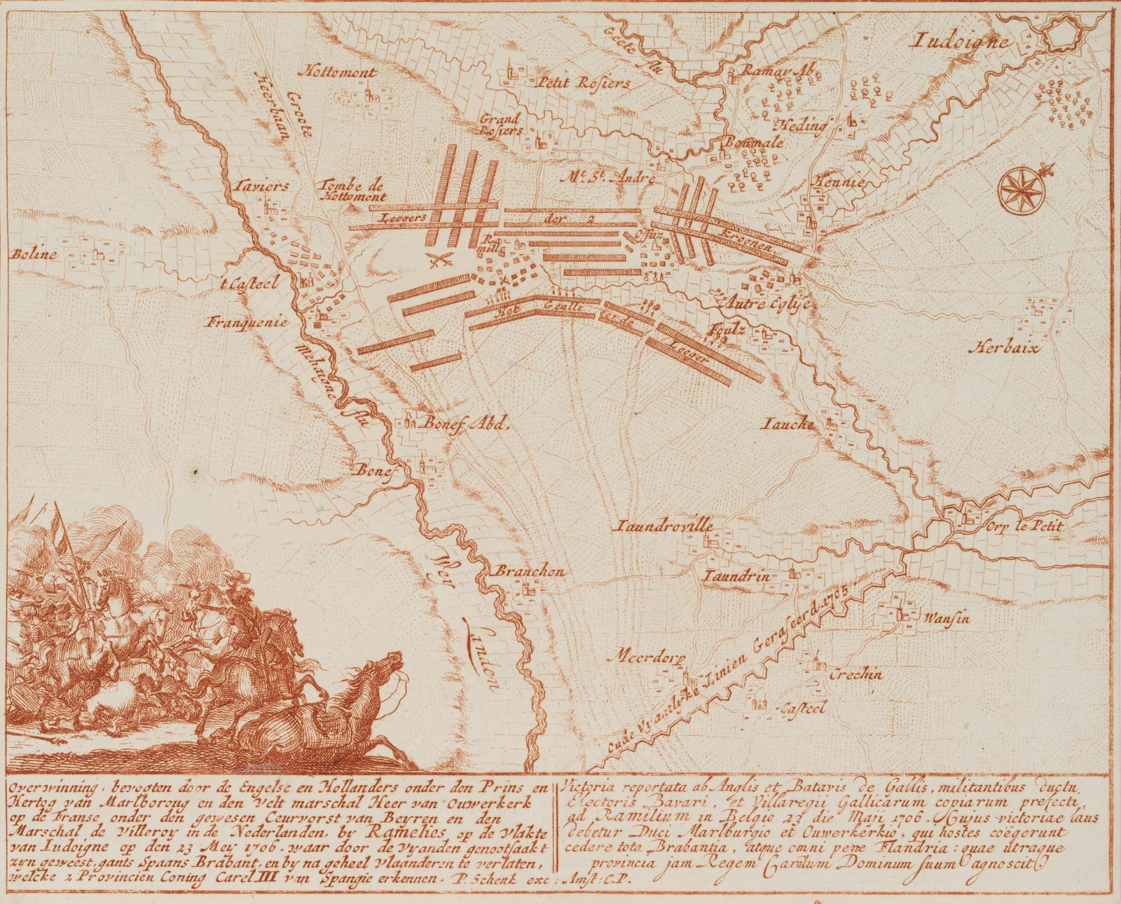 - Bezeichnung: Unterhalb der Darstellung bezeichnet in Niederländisch und Latein: “Overwinning, bevogten door de Engelse en Hollanders onder den Prins en Hertog van Marlboroug en den Velt marschal Heer van Ouwerkerk”. In der Platte signiert und mit Ortsangabe: “Pet. Schenk exc. Amst C. P.”.