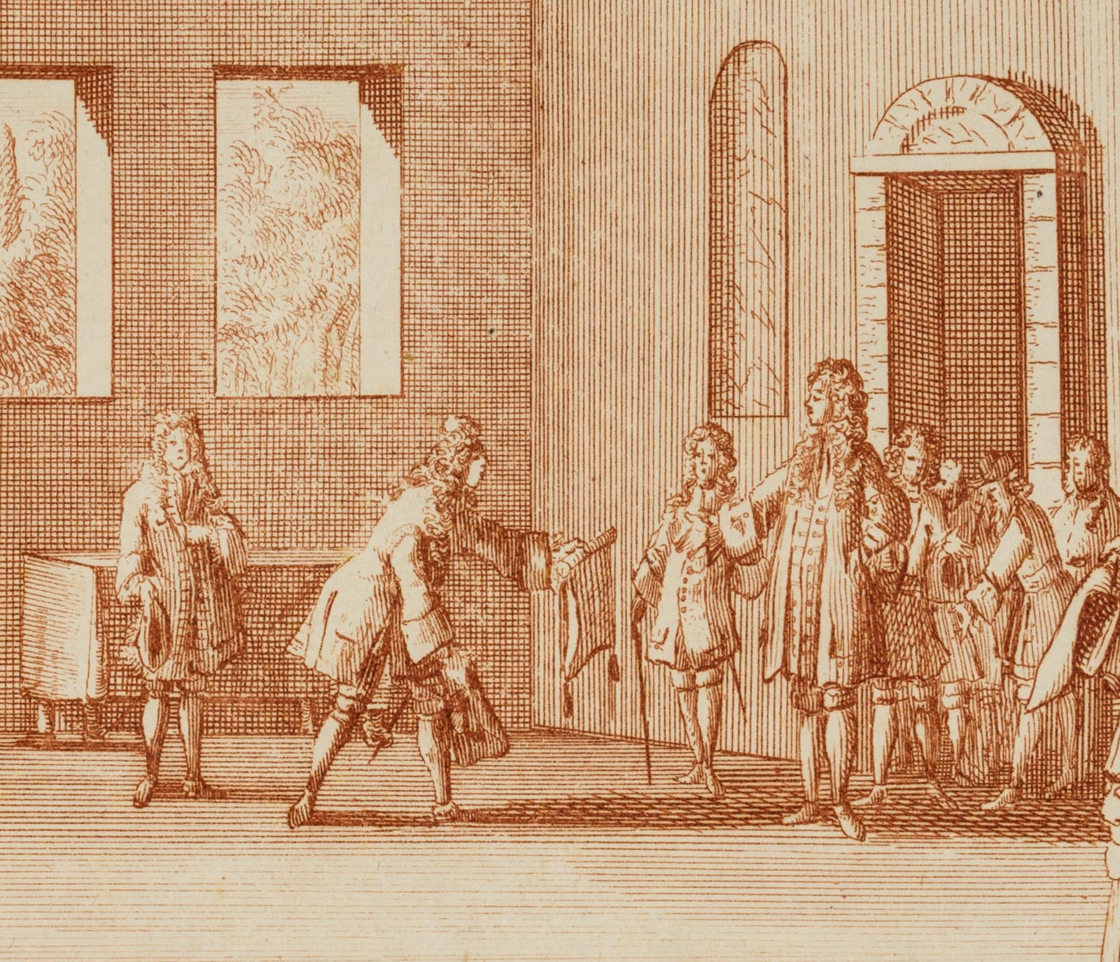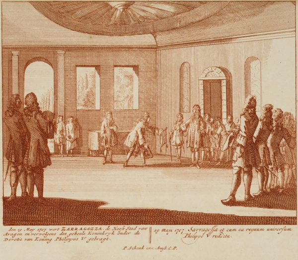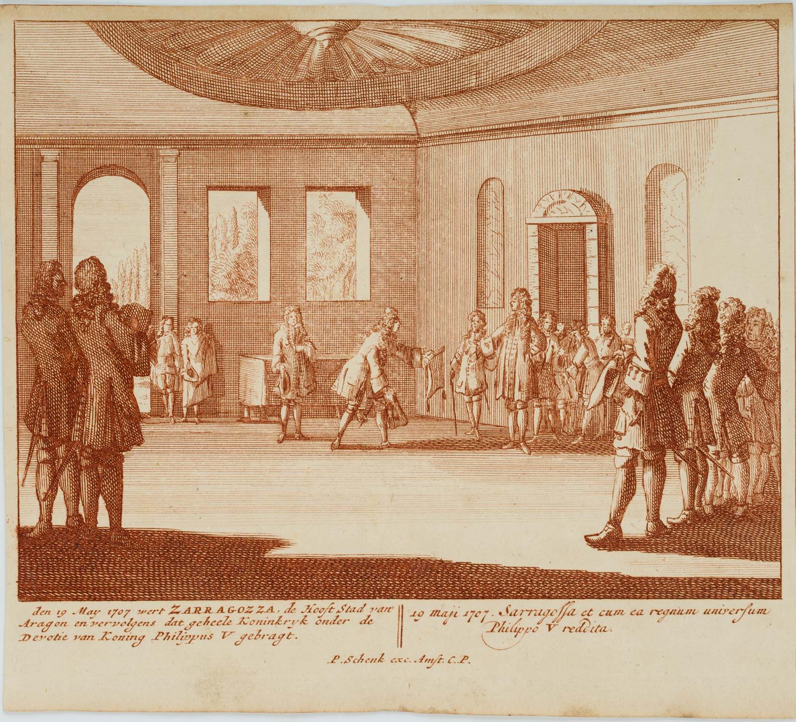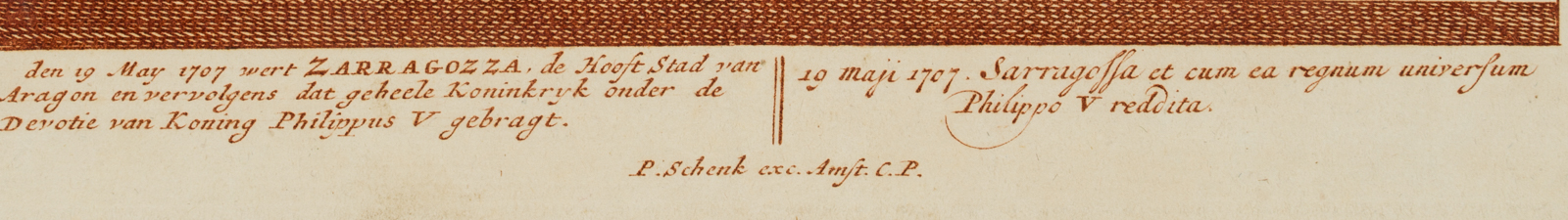 - Inscription: Inscribed below the image in Dutch and Latin: „Den 19. May 1707 wert Zarragozza, de hooft stad van Aragon en vervolgens dat geheele koninkryk onder de devotie van koning Philippus V gebracht.“. Signed in the centre below the image „P. Schenk exc. Amst. C. P.“. Original work: „Schouwburg van den oorlog, beginnende van koning Karel den II. tot op Koning Karel den III“ (Amsterdam : Schenk, first 1706)