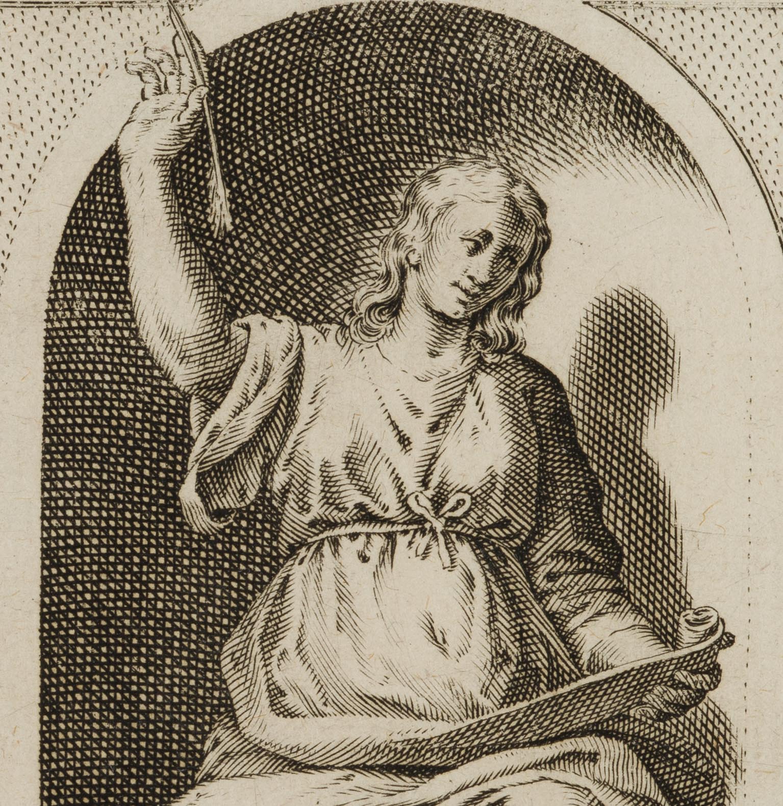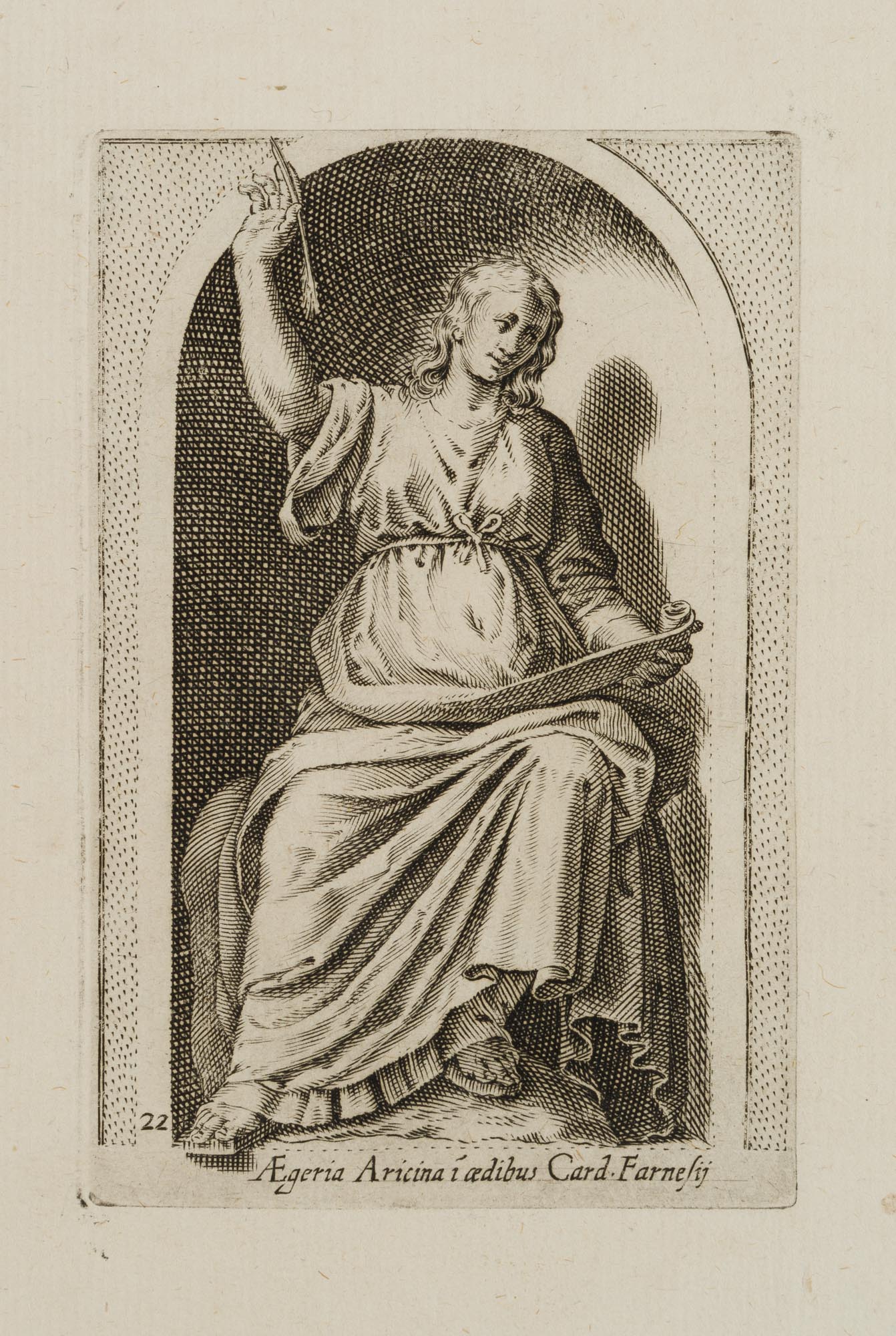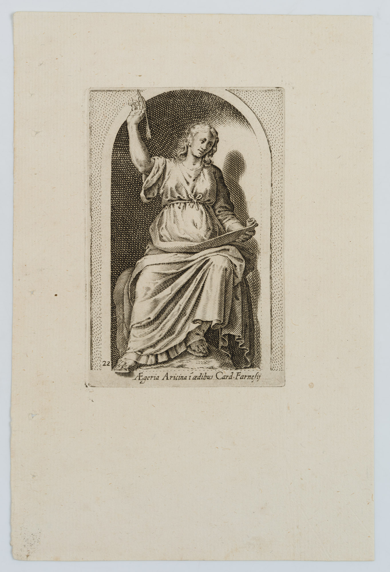 Nach antiker Statue in einer Konche. Aus: Antiquarum statuarum urbis Romae liber primus, P. Thomassin, 1610. Es gilt nach erscheinen des Stichwerks Giovanni Battista de Cavalieri “Antiquarum Statuarum Urbis Romae Tertius et Quartus Liber” (1594) als das erste Werk mit selbstständigen Stichen nach antiken Statuen, von Philippe Thomassin persönlich gezeichnet und gestochen. Der französische Kupferstecher war der erste Lehrmeister Jacques Callots und schuf über 430 Stiche, darunter viele nach Gemälden italienischer Meister wie Michelangelo.Insgesamt handelt es sich um die Illustration von 50 – durchweg in Nischen aufgestellten – antiken Statuen. 23 davon stammen aus der Sammlung Borghese, 5 aus der kapitolinischen Sammlung, jeweils vier aus der Sammlung Medici und aus der Sammlung Farnese, 3 aus Rom: Palazzo Apostolico, Cortile del Belvedere, Statuenhof sowie eine aus der Sammlung Cesarini. Die übrigen sind ohne Angabe des Standortes.Zur Datierung: Als Terminus post quem gilt 1610 aufgrund der Existenz einer Statue der Sammlung Borghese aus dem Nachlass des Guglielmo della Porta (Verkauf 1609 an Giovanni Battista Borghese); terminus ante quem: 1622.Unter der Darstellung innerhalb der Druckplatte bezeichnet: “AEGERIA ARICINA I AEDIBUS CARD. FARNESIJ”.Aus dem Nachlass des Antiquars Rosenthal München / Amsterdam.