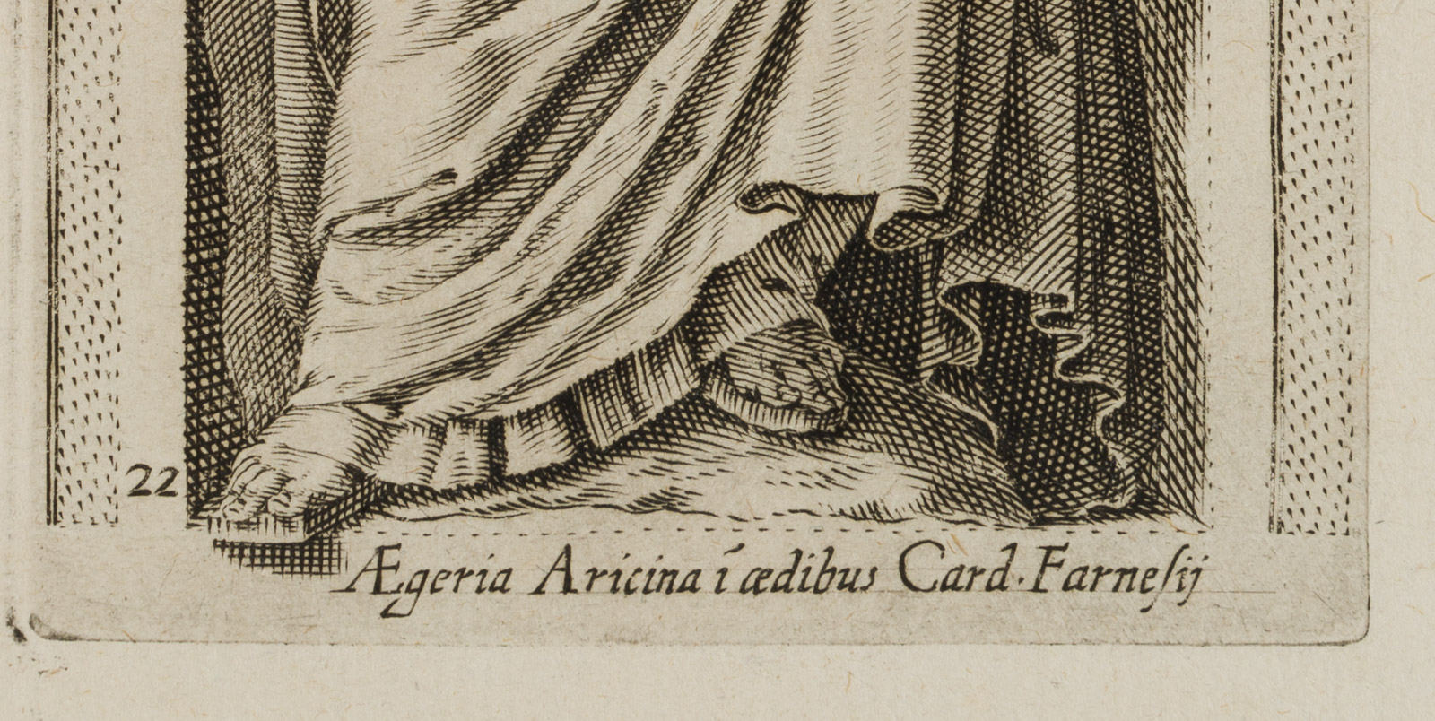 Inscribed below the image within the printing plate: “AEGERIA ARICINA I AEDIBUS CARD. FARNESIJ”.
