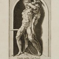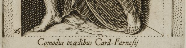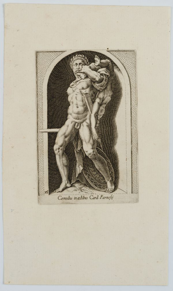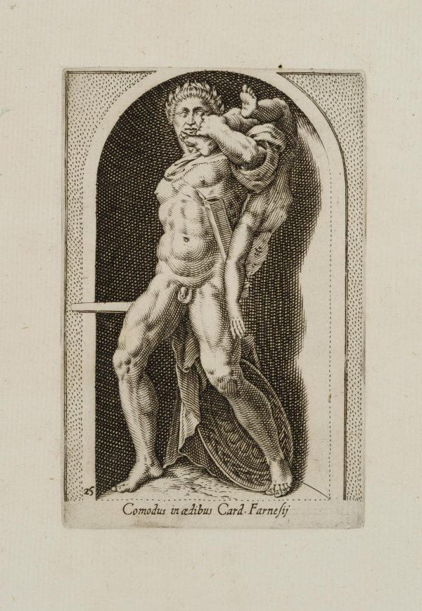 In all, the work involves the illustration of 50 ancient statues, all of which were set up in conchs. 23 of them come from the Borghese Collection, 5 from the Capitoline Collection, four each from the Medici Collection and the Farnese Collection, 3 from Rome: Palazzo Apostolico, Cortile del Belvedere, Statuary Courtyard and one from the Cesarini Collection. The others have no indication of their location. On the dating: 1610 is considered the terminus post quem due to the existence of a statue from the Borghese Collection from the estate of Guglielmo della Porta (sold to Giovanni Battista Borghese in 1609); terminus ante quem: 1622. Inscribed below the depiction within the printing plate: “Comodus in aedibus Card. Farnesij”.
