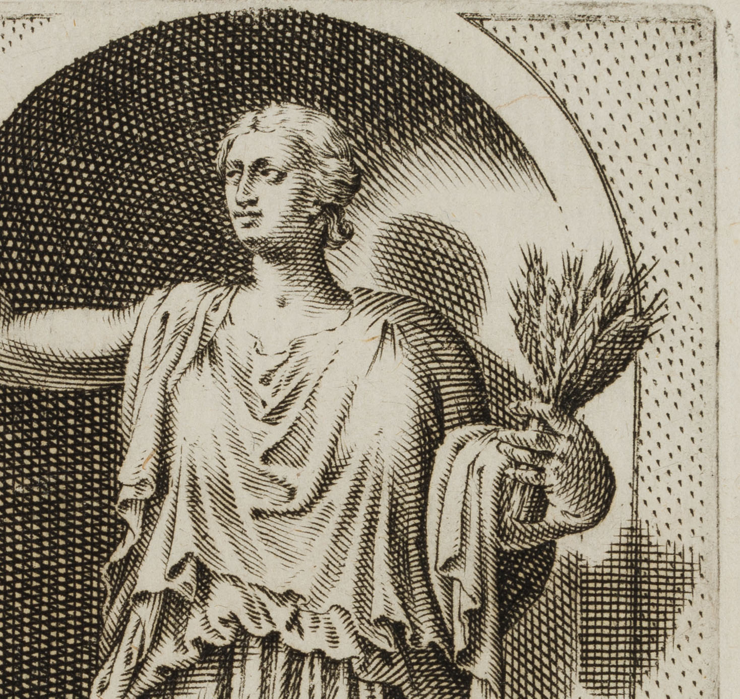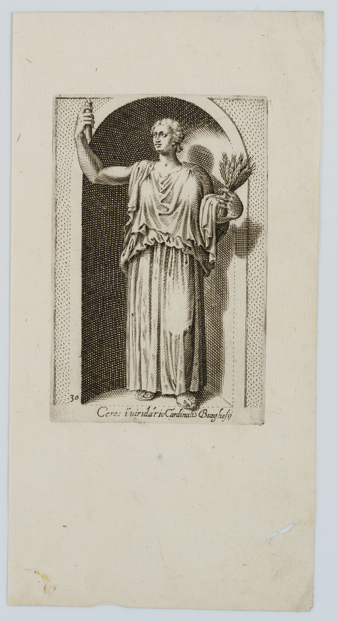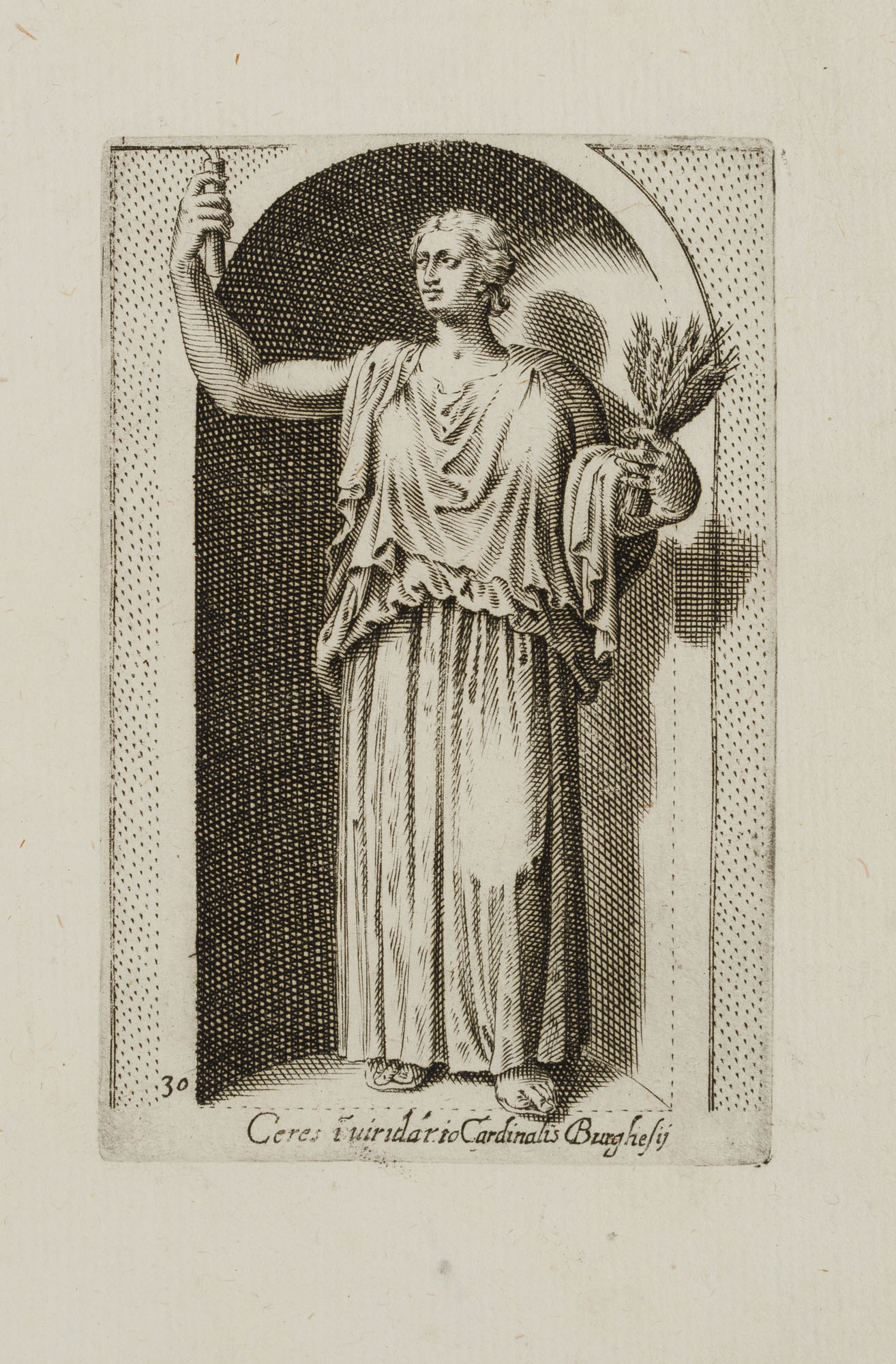 - Description: After ancient statue, in a conch. Ceres is the Roman goddess of agriculture and fertility (Greek: Demeter) and is considered a lawgiver. She is depicted with a bunch of wheat ears. From the Borghese Collection; Inscribed below the depiction within the printing plate: “Ceres uiridario Cardinalis Burghesij”. From: Antiquarum statuarum urbis Romae liber primus, P. Thomassin, 1610. After the publication of Giovanni Battista de Cavalieri’s engraving “Antiquarum Statuarum Urbis Romae Tertius et Quartus Liber” (1594), it is considered to be the first work with independent engravings after antique statues — personally drawn and engraved by Philippe Thomassin.