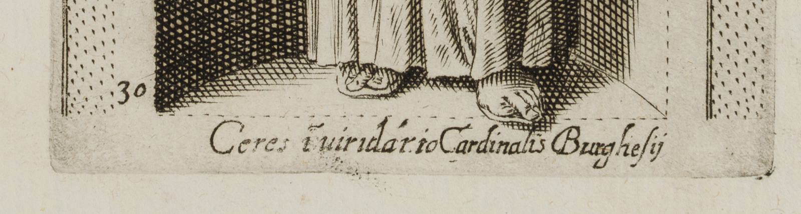 - Beschreibung: Nach antiker Statue, in einer Konche. Ceres ist die römische Göttin des Ackerbaus und der Fruchtbarkeit (griech.: Demeter) und gilt als Gesetzgeberin. Sie ist mit einem Strauß Weizenähren dargestellt. Aus der Sammlung Borghese; Unter der Darstellung innerhalb der Druckplatte bezeichnet: “Ceres uiridario Cardinalis Burghesij”. Aus: Antiquarum statuarum urbis Romae liber primus, P. Thomassin, 1610. Es gilt nach erscheinen des Stichwerks Giovanni Battista de Cavalieri “Antiquarum Statuarum Urbis Romae Tertius et Quartus Liber” (1594) als das erste Werk mit selbstständigen Stichen nach antiken Statuen — von Philippe Thomassin persönlich gezeichnet und gestochen.