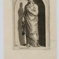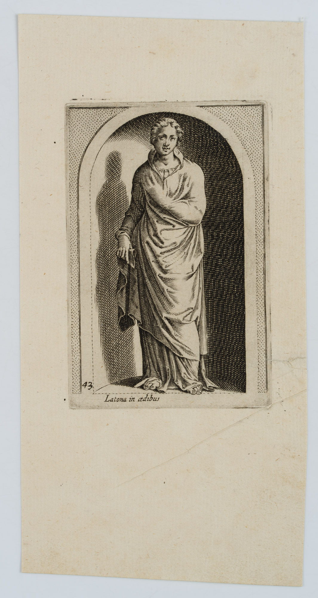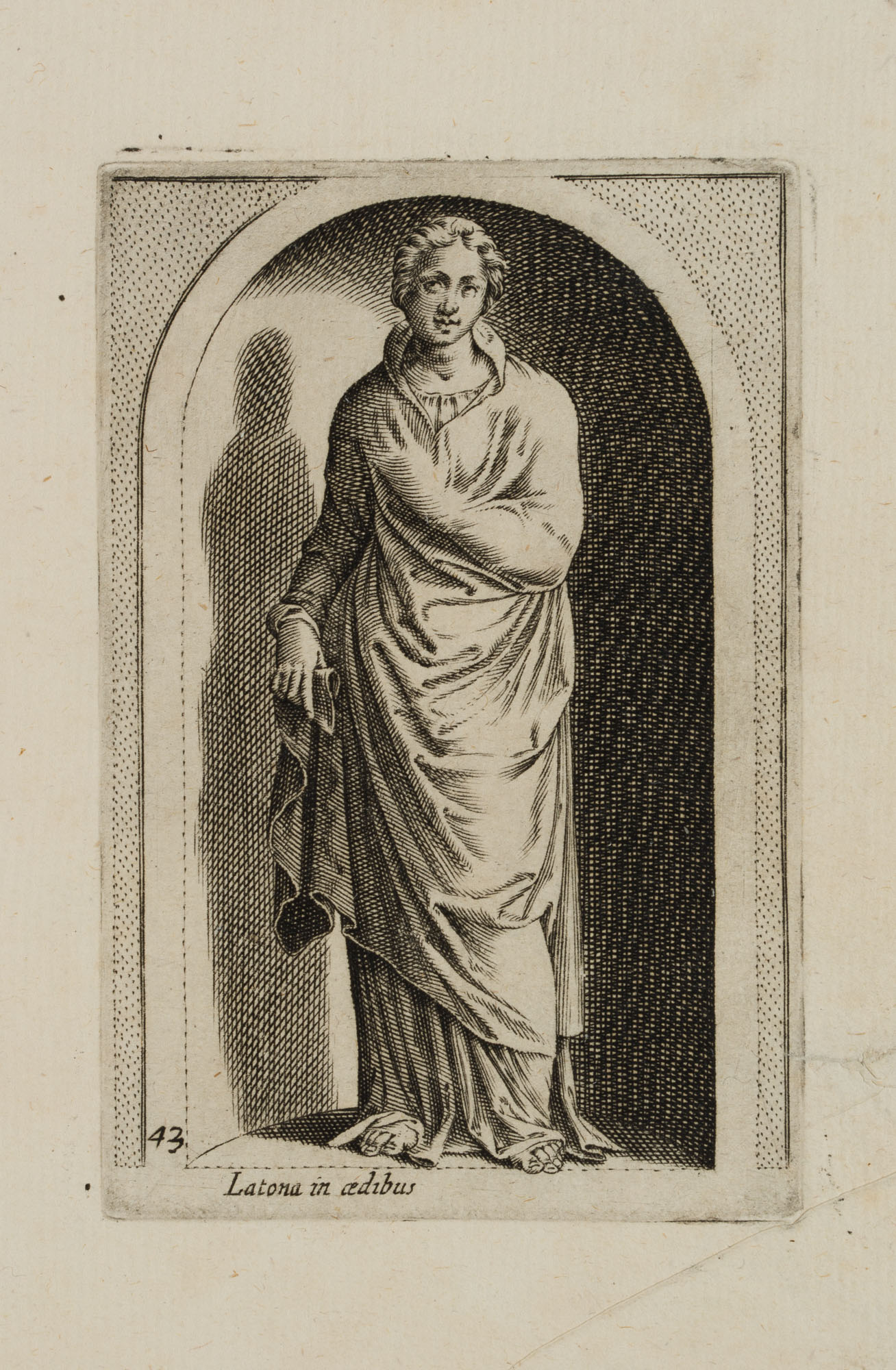 - Description: After an antique statue in a conch. Inscribed below the image within the printing plate: “Latona in aedibus”. From: Antiquarum statuarum urbis Romae liber primus, P. Thomassin, 1610. After the publication of Giovanni Battista de Cavalieri’s engraving work “Antiquarum Statuarum Urbis Romae Tertius et Quartus Liber” (1594), it is considered the first work with independent engravings after antique statues — drawn and engraved by Philippe Thomassin himself.