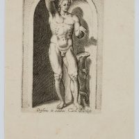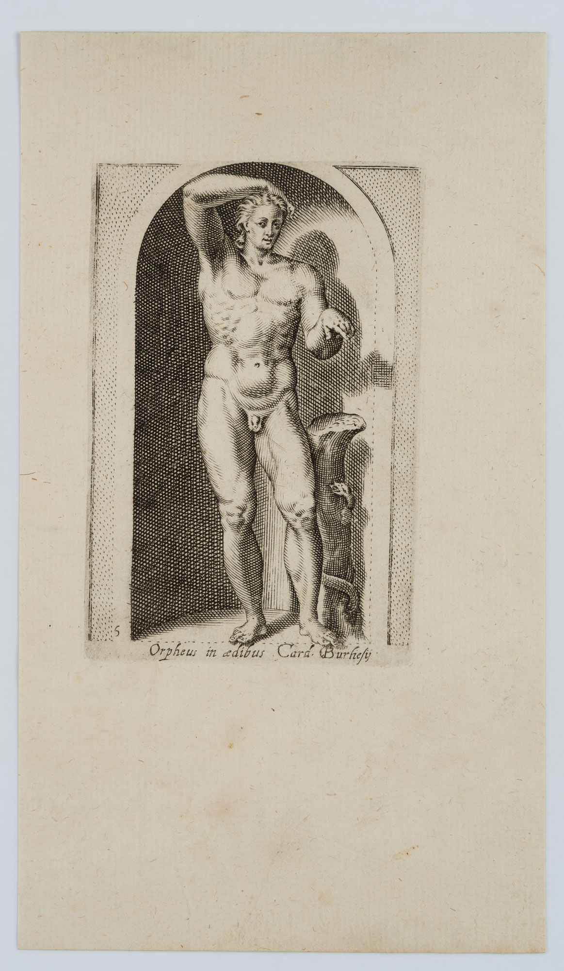 - Description: After an ancient statue in a conch, reproduction of a sculpture. The singer and poet Orpheus from Greek mythology descended into the realm of the dead out of love for his wife Eurydice. Inscribed below the depiction within the printing plate: “Orpheus in aedibus Card. Burghesij”. From: Antiquarum statuarum urbis Romae liber primus, P. Thomassin, 1610. After the publication of Giovanni Battista de Cavalieri’s engraving “Antiquarum Statuarum Urbis Romae Tertius et Quartus Liber” (1594), it is considered to be the first work with independent engravings after antique statues — drawn and engraved by Philippe Thomassin himself.