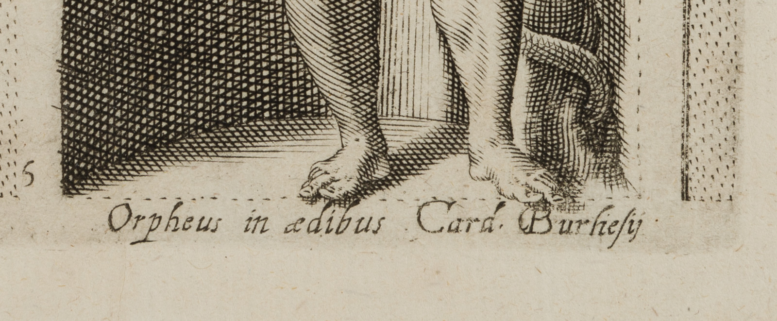 - Beschreibung: Nach antiker Statue in einer Konche, Reproduktion einer Skulptur. Der Sänger und Dichter Orpheus aus der griechischen Mythologie stieg aus Liebe zu seiner Frau Eurydike ins Totenreich hinab. Unter der Darstellung innerhalb der Druckplatte bezeichnet: “Orpheus in aedibus Card. Burghesij”. Aus: Antiquarum statuarum urbis Romae liber primus, P. Thomassin, 1610. Es gilt nach erscheinen des Stichwerks Giovanni Battista de Cavalieri “Antiquarum Statuarum Urbis Romae Tertius et Quartus Liber” (1594) als das erste Werk mit selbstständigen Stichen nach antiken Statuen — von Philippe Thomassin persönlich gezeichnet und gestochen.