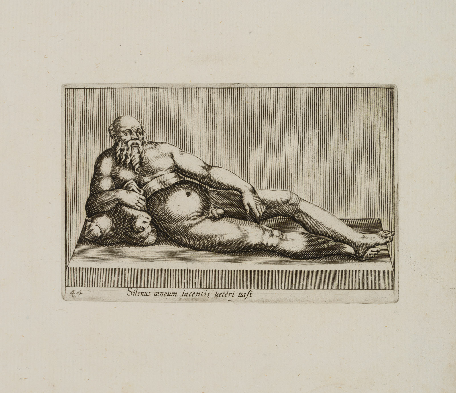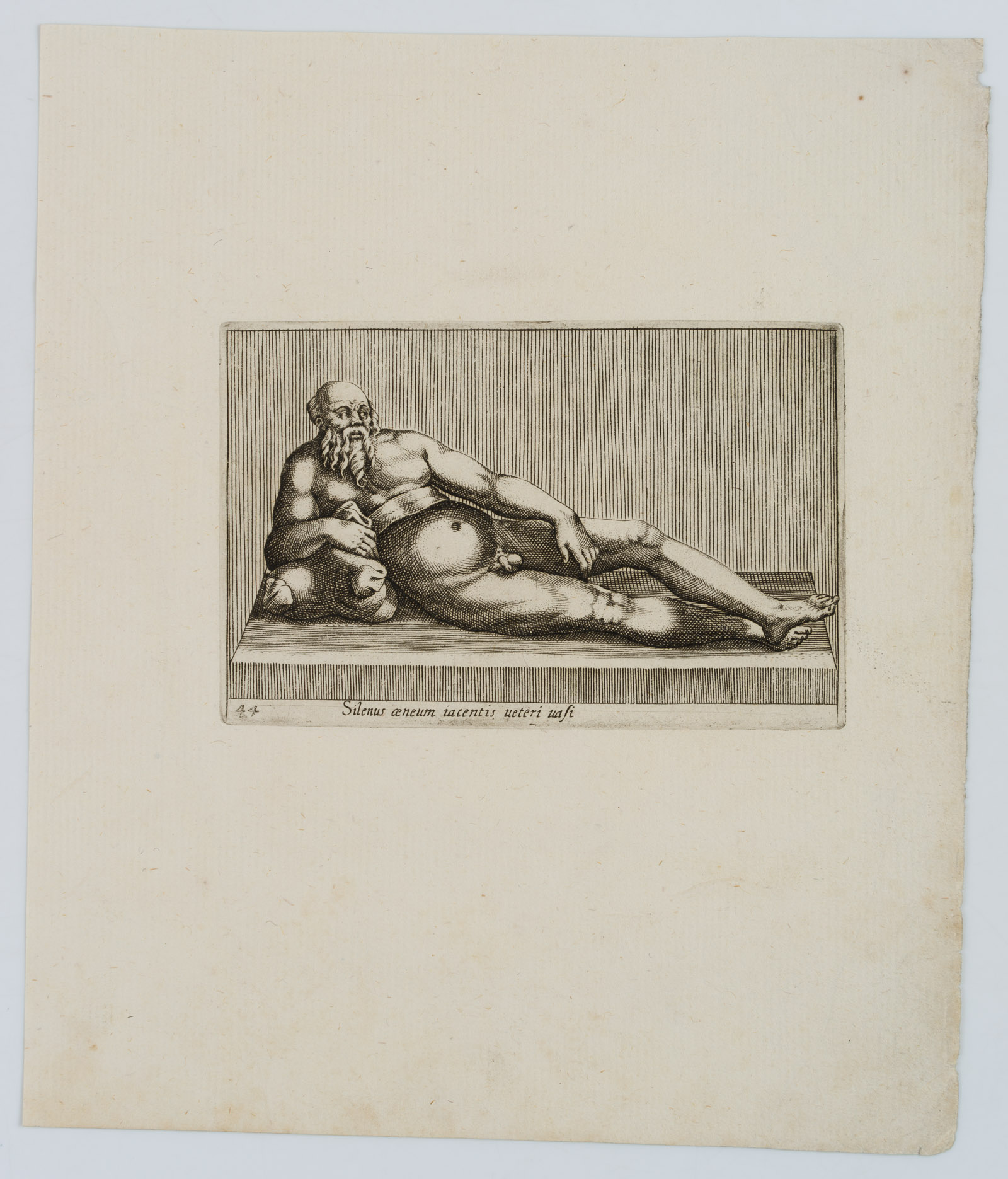 Nach antiker Statue, in einer Konche. Darstellung des Silenos’, er war der Lehrer des Dionysos und Begleiter bei seinen Umzügen. An ihn richtet sich eine der Orphischen Hymnen. Unter der Darstellung innerhalb der Druckplatte bezeichnet: “Silenus aeneum iacentis ueteri uasi”. Aus: Antiquarum statuarum urbis Romae liber primus, P. Thomassin, 1610. Es gilt nach erscheinen des Stichwerks Giovanni Battista de Cavalieri “Antiquarum Statuarum Urbis Romae Tertius et Quartus Liber” (1594) als das erste Werk mit selbstständigen Stichen nach antiken Statuen — von Philippe Thomassin persönlich gezeichnet und gestochen.Der französische Kupferstecher war der erste Lehrmeister Jacques Callots; er schuf über 430 Stiche, darunter viele nach Gemälden italienischer Meister wie Michelangelo.Insgesamt handelt es sich um die Illustration von 50 – durchweg in Konchen aufgestellten – antiken Statuen. 23 davon stammen aus der Sammlung Borghese, 5 aus der kapitolinischen Sammlung, jeweils vier aus der Sammlung Medici und aus der Sammlung Farnese, 3 aus Rom: Palazzo Apostolico, Cortile del Belvedere, Statuenhof sowie eine aus der Sammlung Cesarini. Die übrigen sind ohne Angabe des Standortes.Zur Datierung: Als Terminus post quem gilt 1610 aufgrund der Existenz einer Statue der Sammlung Borghese aus dem Nachlass des Guglielmo della Porta (Verkauf 1609 an Giovanni Battista Borghese); terminus ante quem: 1622.Aus dem Nachlass des Antiquars Rosenthal München / Amsterdam. | Wasserzeichen: Lilie