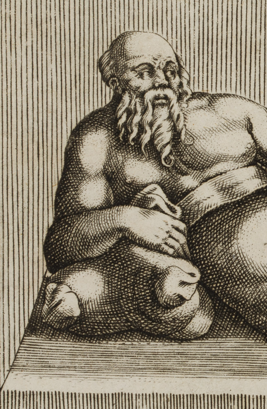 • Description: After an ancient statue, in a conch. Representation of Silenos, he was the teacher of Dionysus and companion in his processions. One of the Orphic hymns is addressed to him. Inscribed below the depiction within the printing plate: “Silenus aeneum iacentis ueteri uasi”. From: Antiquarum statuarum urbis Romae liber primus, P. Thomassin, 1610. After the publication of Giovanni Battista de Cavalieri’s engraving work “Antiquarum Statuarum Urbis Romae Tertius et Quartus Liber” (1594), it is considered the first work with independent engravings after antique statues — drawn and engraved by Philippe Thomassin himself.