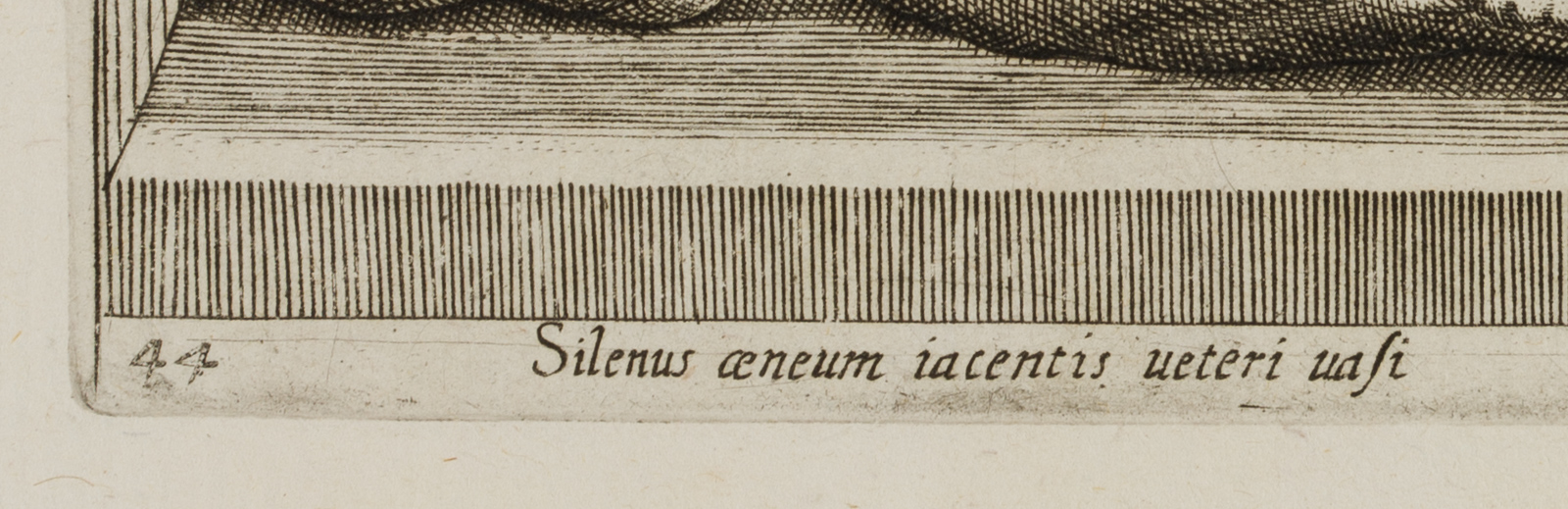 • Beschreibung: Nach antiker Statue, in einer Konche. Darstellung des Silenos’, er war der Lehrer des Dionysos und Begleiter bei seinen Umzügen. An ihn richtet sich eine der Orphischen Hymnen. Unter der Darstellung innerhalb der Druckplatte bezeichnet: “Silenus aeneum iacentis ueteri uasi”. Aus: Antiquarum statuarum urbis Romae liber primus, P. Thomassin, 1610. Es gilt nach erscheinen des Stichwerks Giovanni Battista de Cavalieri “Antiquarum Statuarum Urbis Romae Tertius et Quartus Liber” (1594) als das erste Werk mit selbstständigen Stichen nach antiken Statuen — von Philippe Thomassin persönlich gezeichnet und gestochen.
