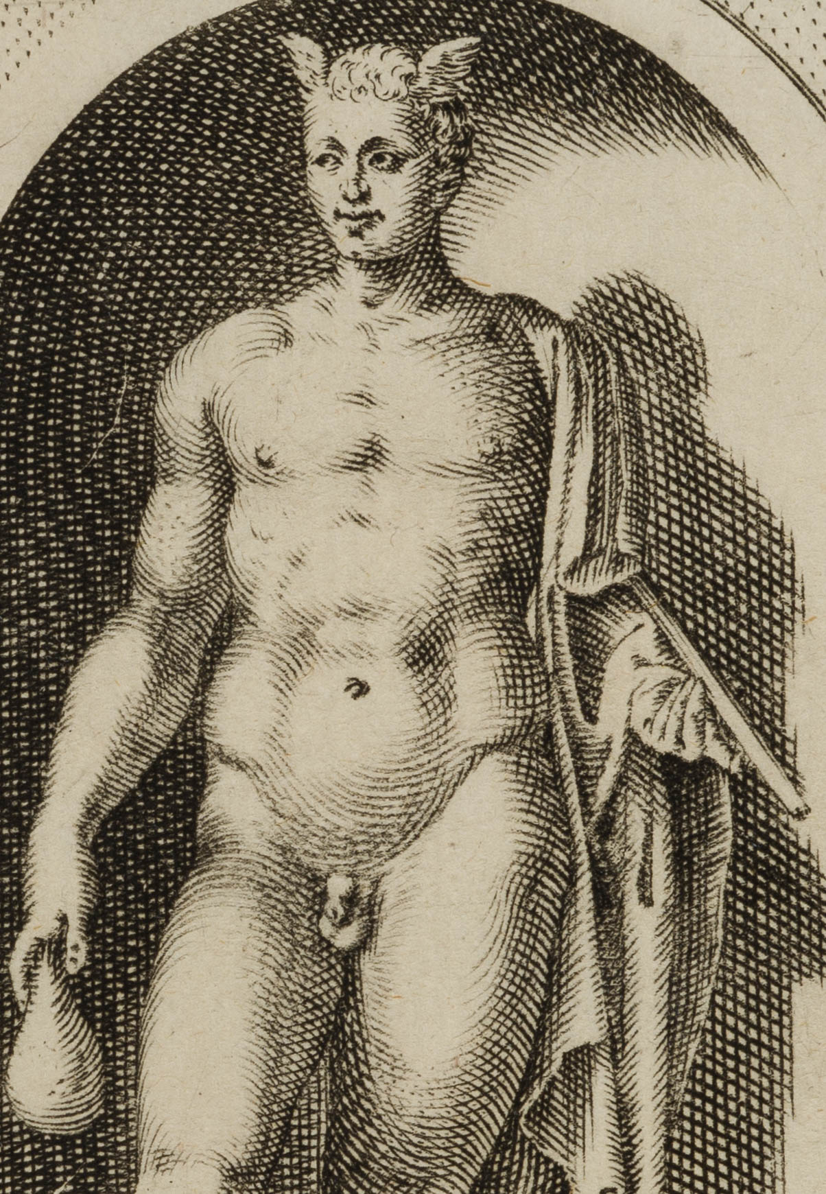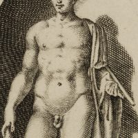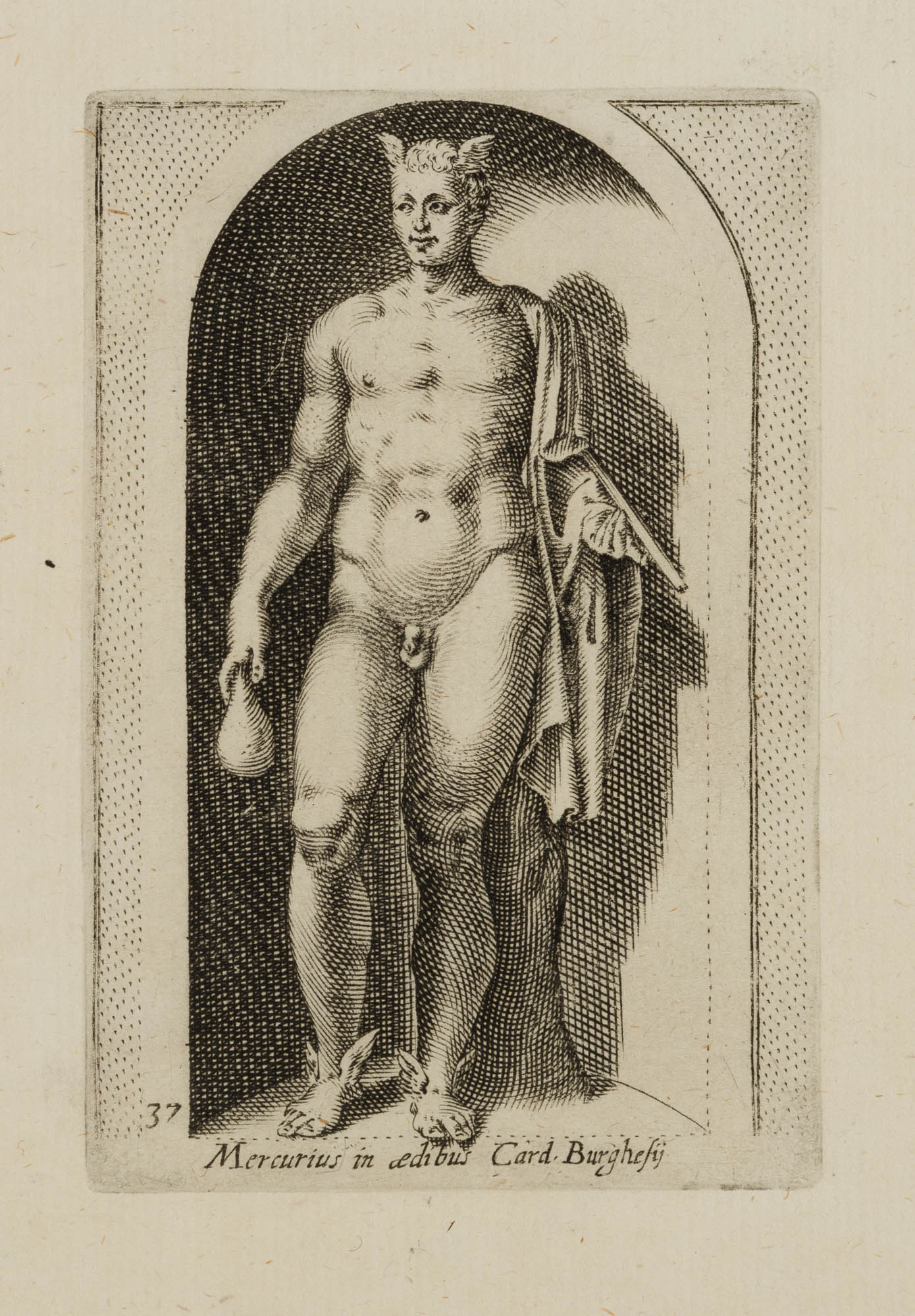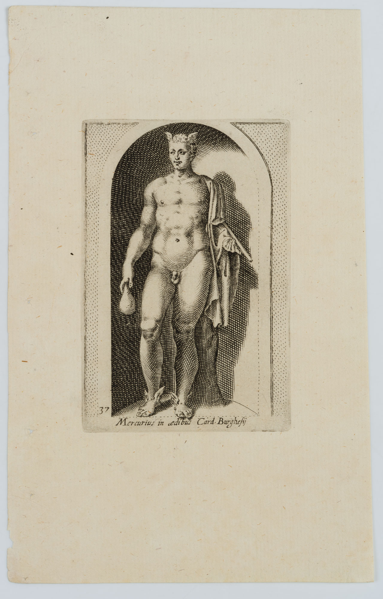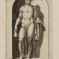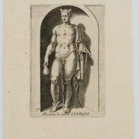 - Description: After ancient statue in a conch; Mercury, messenger of the gods and god of merchants and thieves, with attributes: Winged shoes, Hermes’ staff and a purse which he holds in his right hand. Inscribed below the depiction within the printing plate: “Mercurius in aedibus Card. Burghesij”. From: Antiquarum statuarum urbis Romae liber primus, P. Thomassin, 1610. After the publication of Giovanni Battista de Cavalieri’s engraving “Antiquarum Statuarum Urbis Romae Tertius et Quartus Liber” (1594), it is considered to be the first work with independent engravings after antique statues – personally drawn and engraved by Philippe Thomassin.