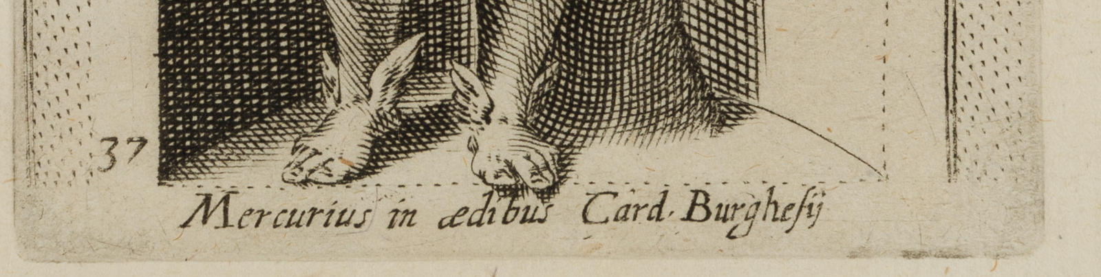 - Beschreibung: Nach antiker Statue in einer Konche; Merkur, der Götterbote und Gott der Händler und Diebe, mit Attributen: Flügelschuhen, Hermesstab und einem Geldbeutel, den er in der rechten Hand hält. Unter der Darstellung innerhalb der Druckplatte bezeichnet: “Mercurius in aedibus Card. Burghesij”. Aus: Antiquarum statuarum urbis Romae liber primus, P. Thomassin, 1610. Es gilt nach erscheinen des Stichwerks Giovanni Battista de Cavalieri “Antiquarum Statuarum Urbis Romae Tertius et Quartus Liber” (1594) als das erste Werk mit selbstständigen Stichen nach antiken Statuen – von Philippe Thomassin persönlich gezeichnet und gestochen.