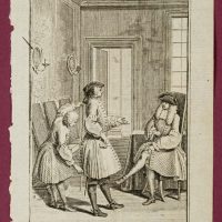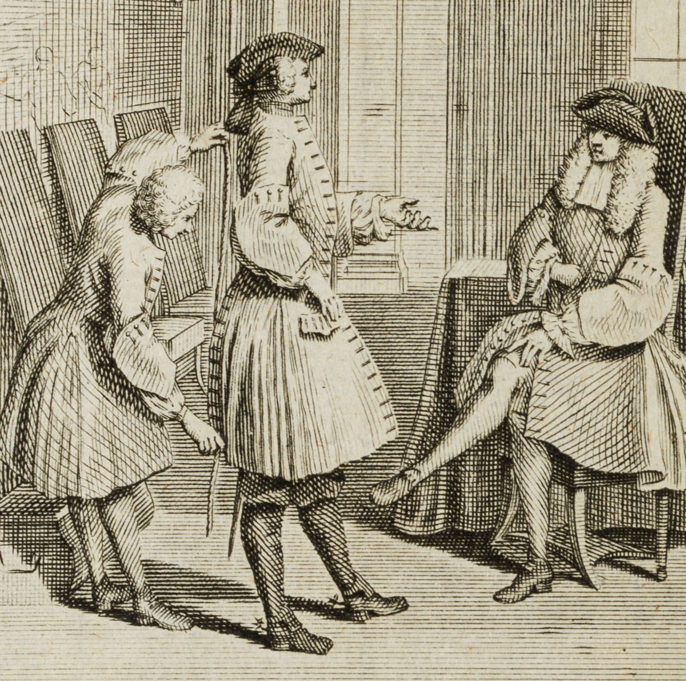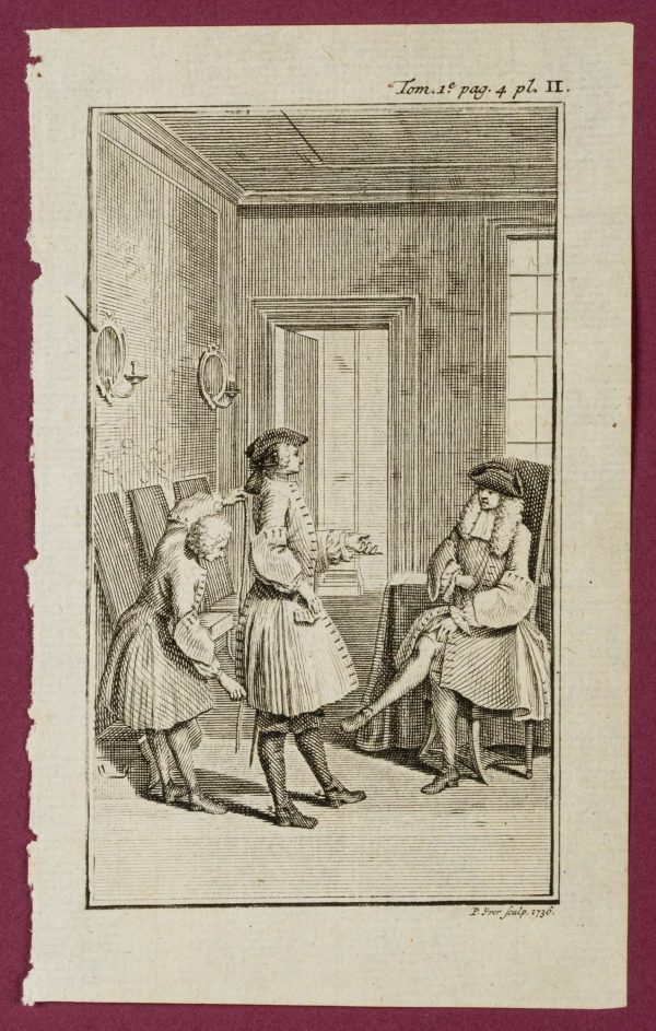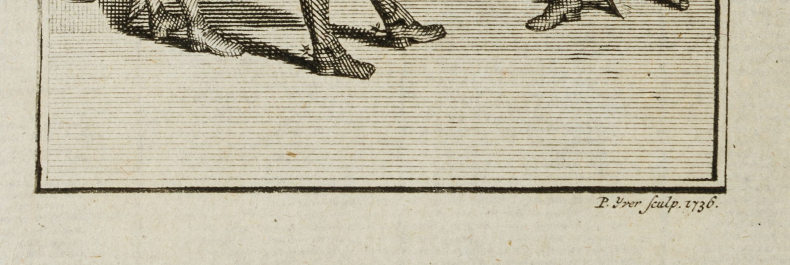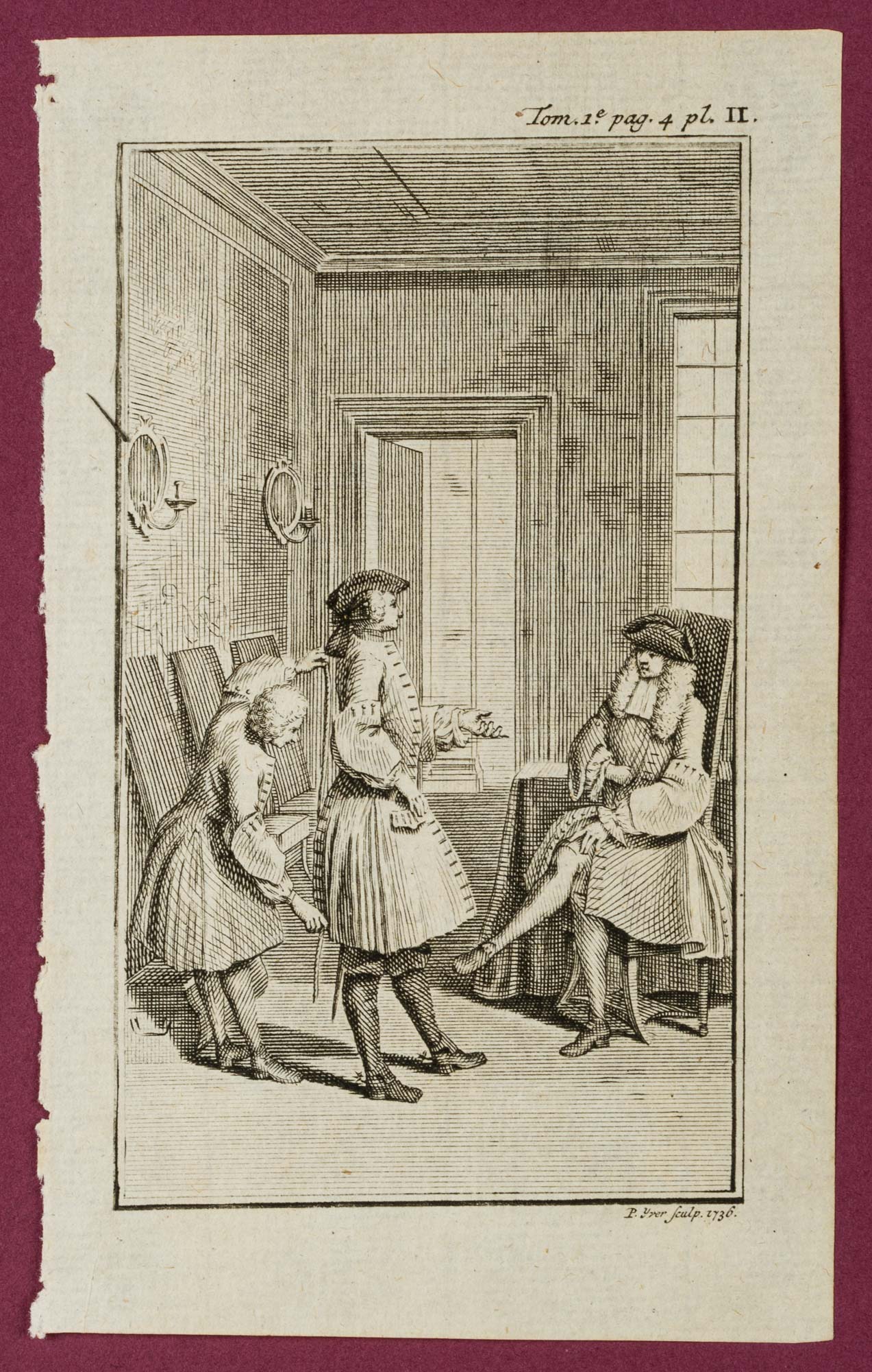 - Beschreibung: Während zwei Edelleute mit weißgepuderten Perücken und in barocker Mode gekleidet ein Gespräch führen, nimmt ein Schneider an dem Stehenden Maß. Die Graphik ist oben rechts nummeriert mit “Tom. 1.e pag. 4 pl. II.” und rechts unten signiert mit “P. Yver sculp. 1736.”.