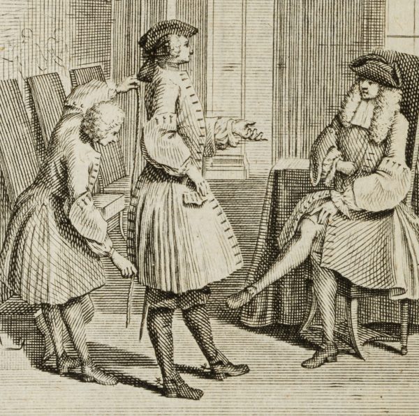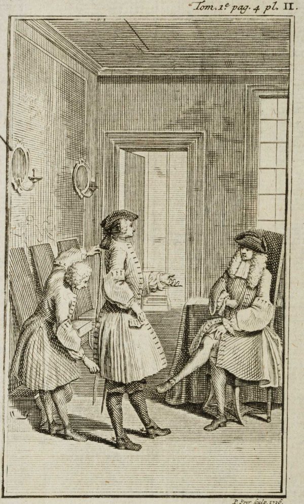 - Description: While two noblemen in white powdered wigs and dressed in baroque fashion are having a conversation, a tailor is taking measurements of the standing man. The print is numbered “Tom. 1.e pag. 4 pl. II.” and signed lower right with “P. Yver sculp. 1736.”.
