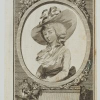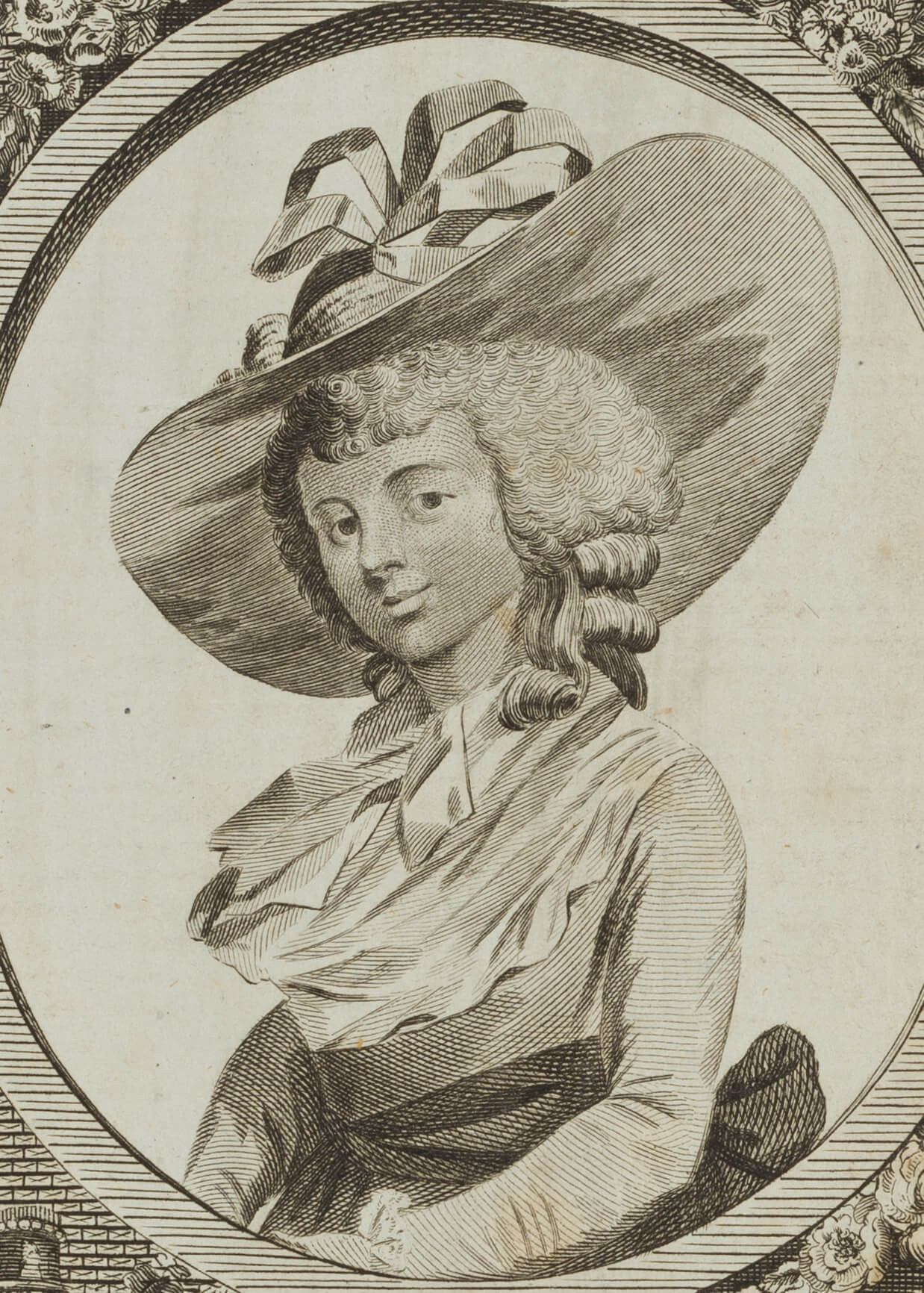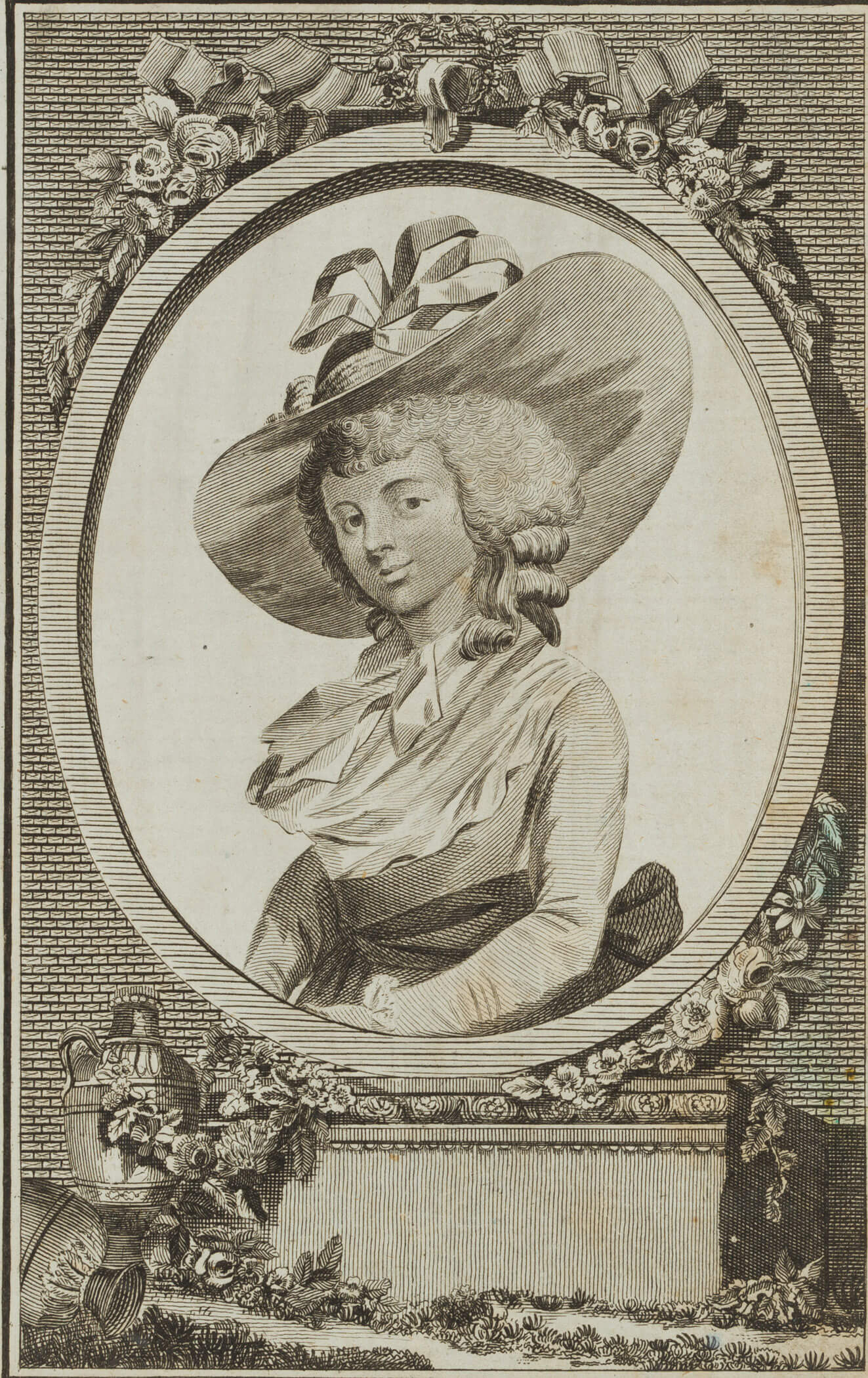 - Description: Half-length portrait with a broad-brimmed hat in an oval frame decorated with floral motifs on a pedestal
