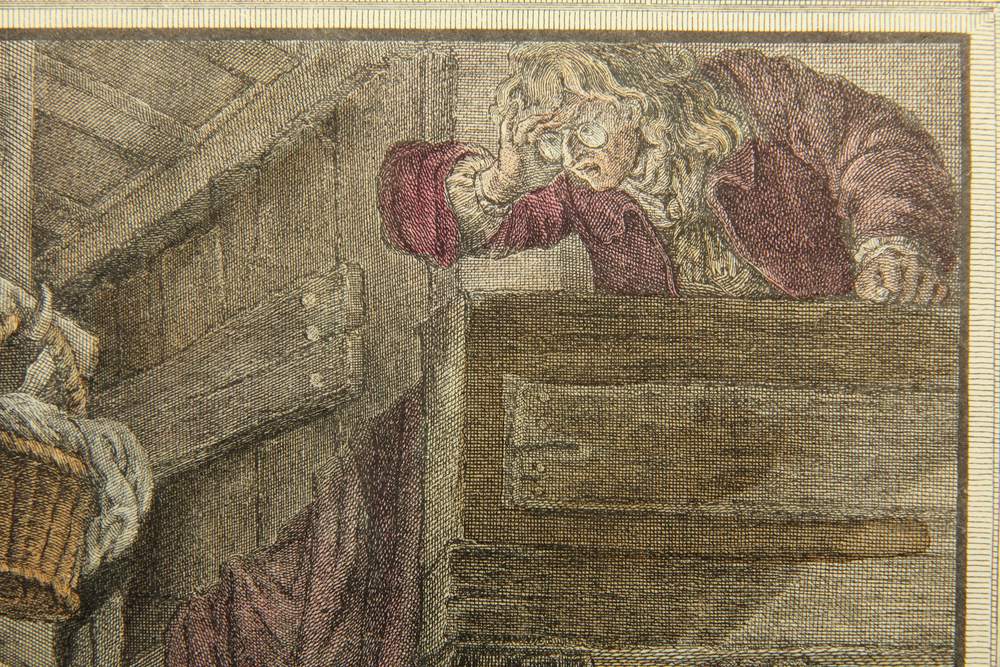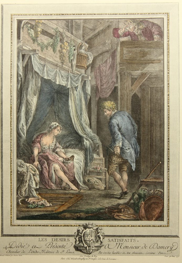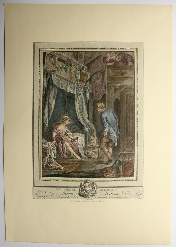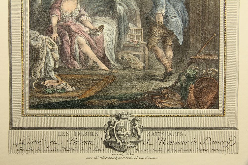 • Bezeichnung: Oben rechts ist ein voyeuristischer Betrachter zu sehen. Die Darstellung ist von einem fingierten Rahmen umgeben und unterhalb mit einem Wappen versehen. Daneben befindet sich die französischsprachige Bezeichnung: “Dédié en Présenté a Monsieur de Damery[.]”. Darunter sind die Signaturen der Künstler sowie eine Datierung auf 1772 und ein Verweis auf den Verlag Hénault et Rapilly in Croix de Lorraine zu sehen.