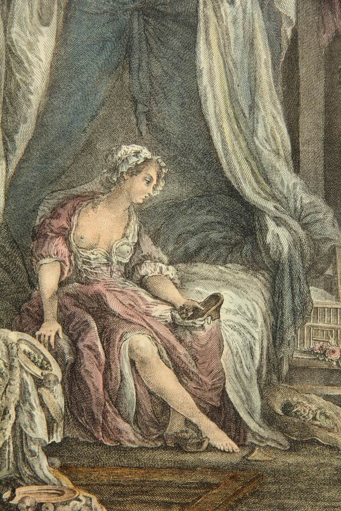• Description: Reproduction print of a coloured copper engraving on laid paper. Suggestive depiction of a pair of lovers in a chamber, undressing. The young woman is sitting on a four-poster bed.