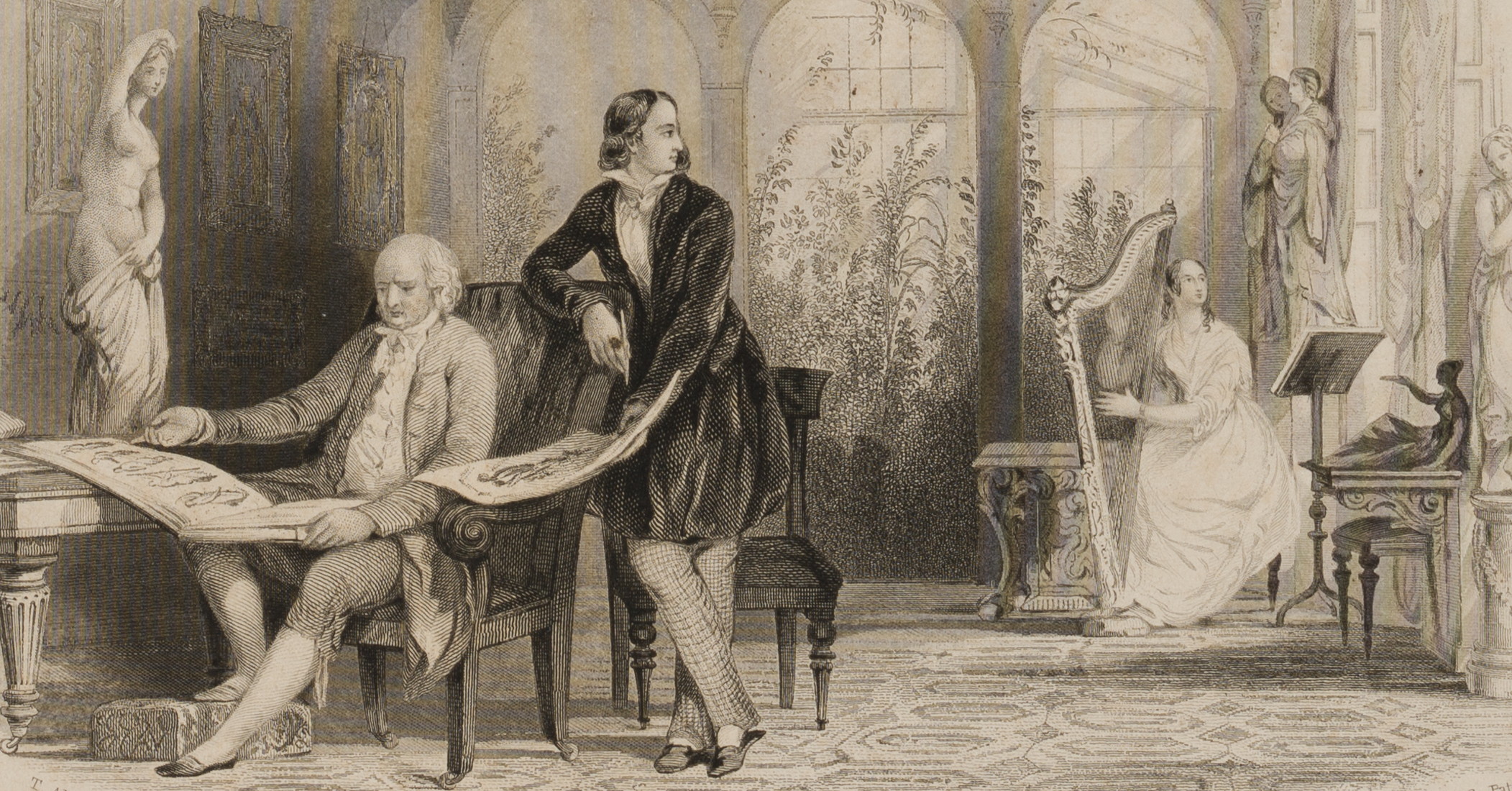 - Description: Interior scene with a seated man on the left sheeting through a drawing book, on a table next to him a statue of a female nude, over his shoulder is a young artist with crayon in hand, handing his teacher more drawings, but distracted by the young woman practising her harp in the background, behind her a conservatory through arches.